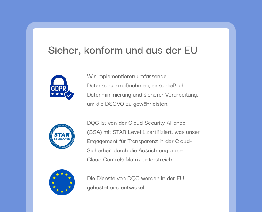 Sicher & verantwortungsvoll - DQC hat seinen Hauptsitz in München, Deutschland. Wir legen Wert auf Datensicherheit und Nutzerkontrolle. Vollständig DSGVO-konform. Die DQC Platform ist als SaaS oder Private Cloud verfügbar und Ihre Daten bleiben immer in Ihren Systemen. Es werden keine Kopien erstellt. Außerdem benötigt die DQC Platform nur Leserechte. Schließlich können Unternehmen ihre eigenen LLMs mitbringen.