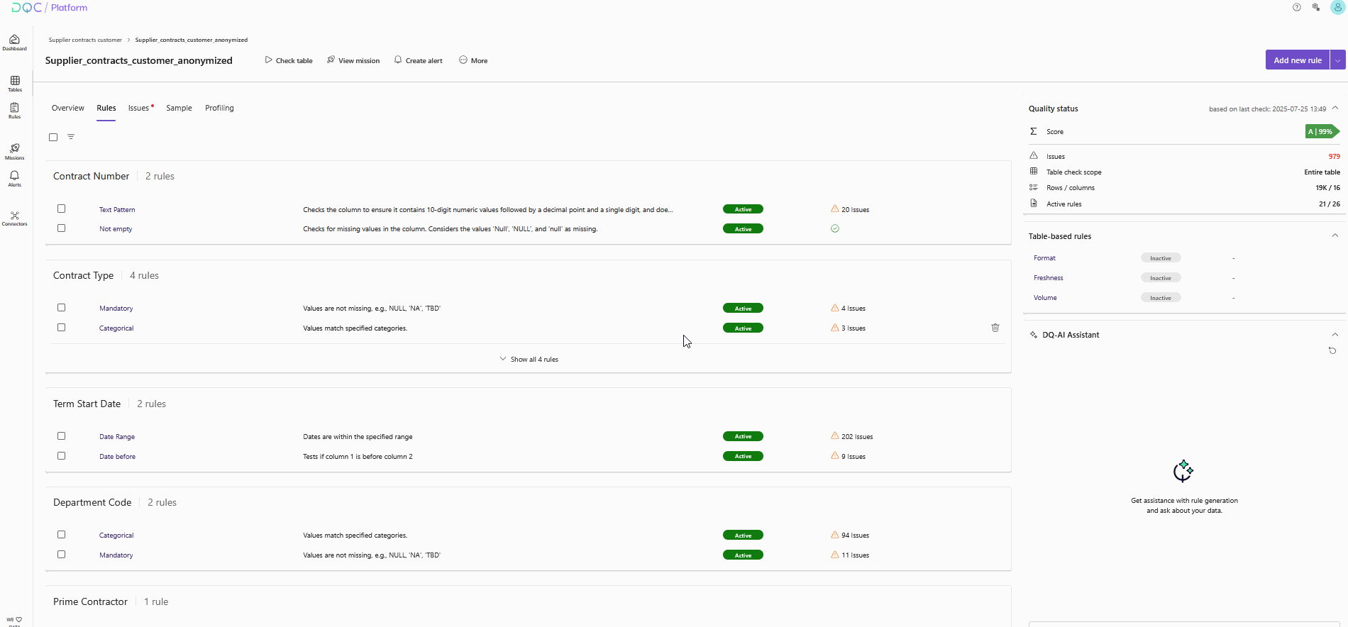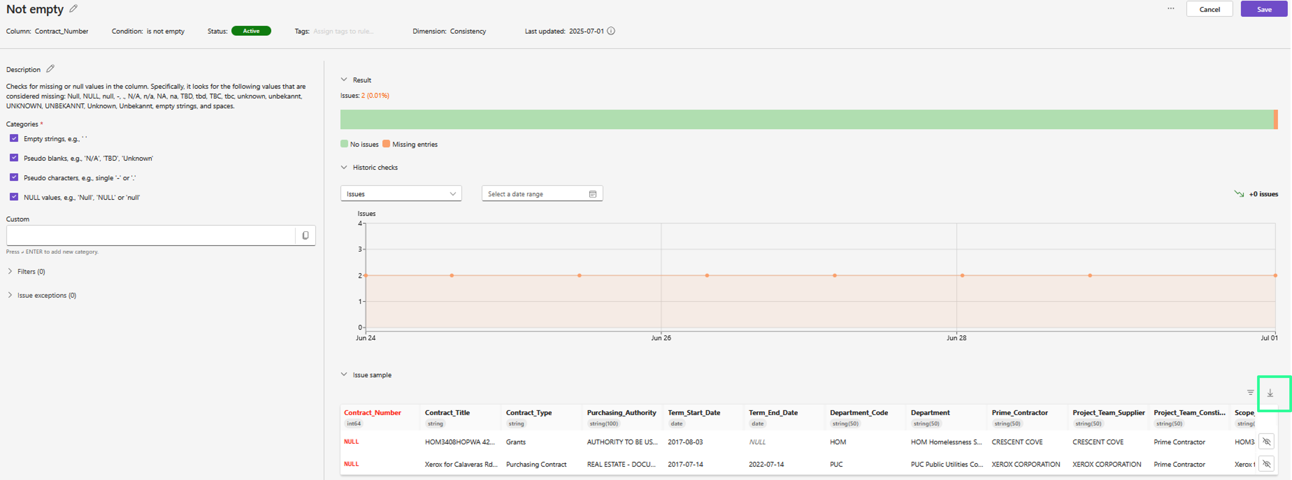 Für jede Regel in der DQC Platform lässt sich eine Issue Table herunterladen – also eine CSV-Datei mit den Zeilen, die gegen die Regel verstoßen haben. So kannst Du die Ergebnisse weiter analysieren, archivieren oder teilen.