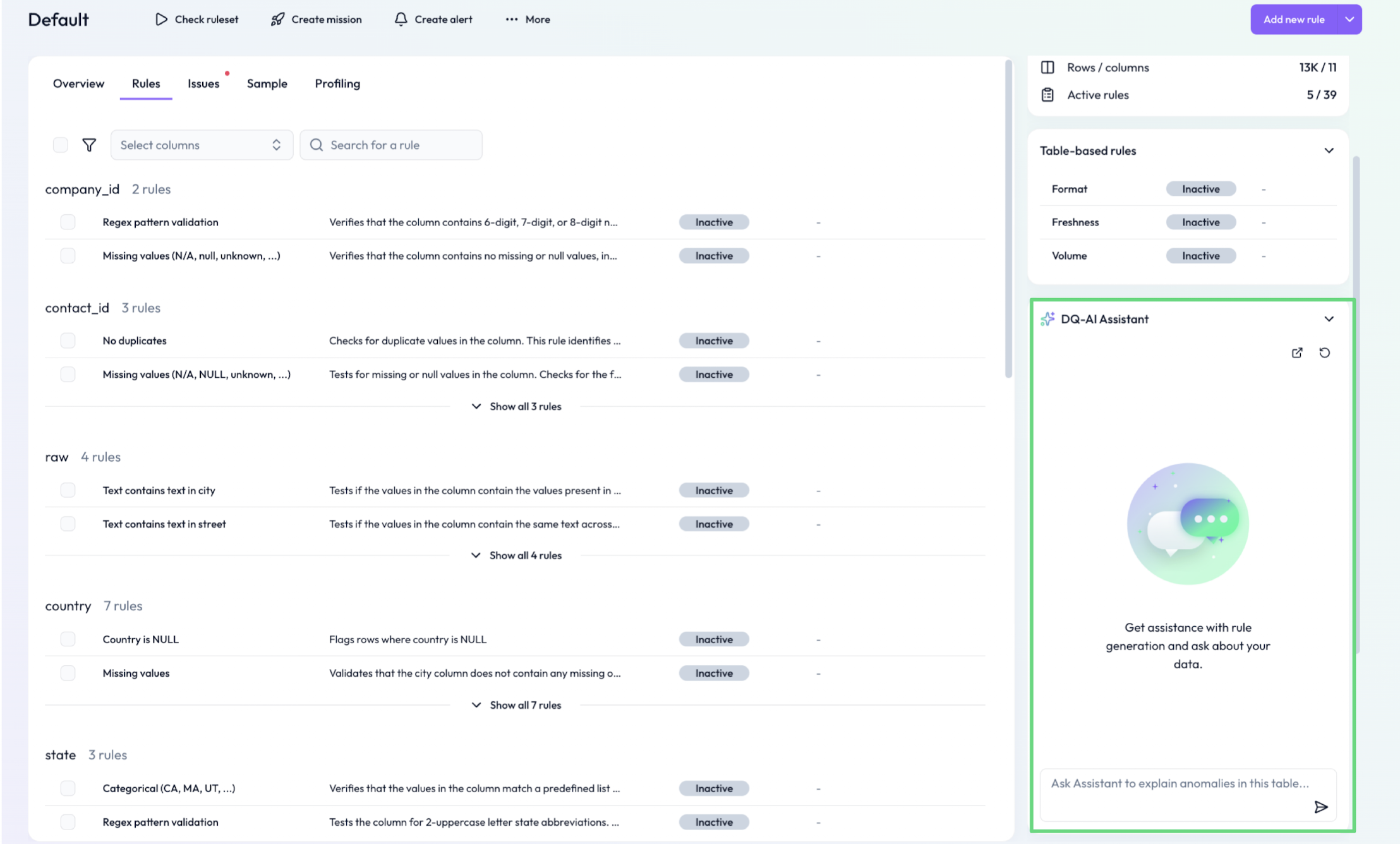 Der DQ-AI Assistant hilft Dir, Struktur und Inhalt einer Tabelle besser zu verstehen – und erste Regelideen abzuleiten. Er ist beim Arbeiten mit Tabellen immer auf der rechten Bildschirmseite verfügbar.