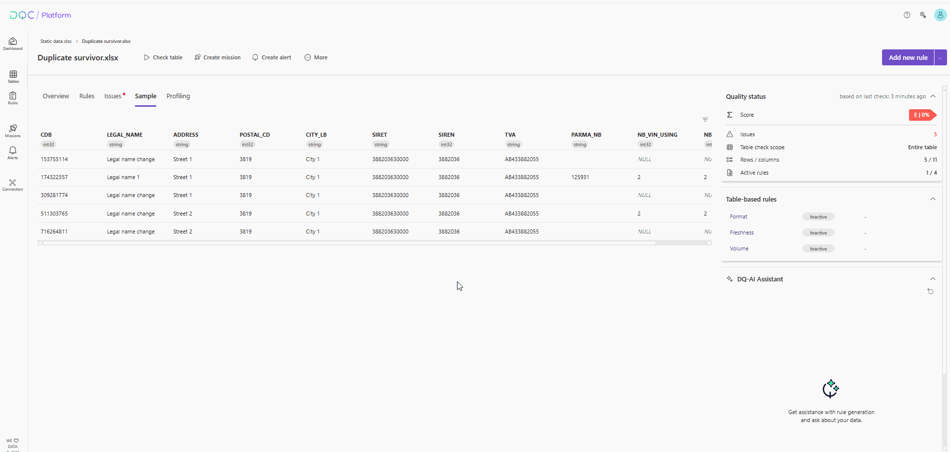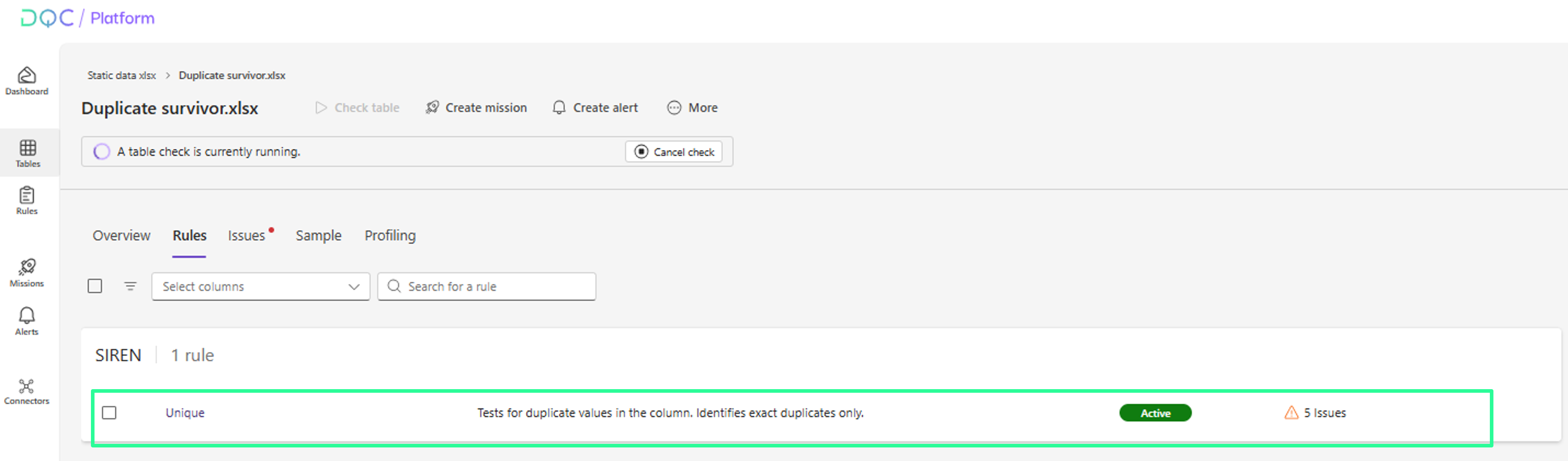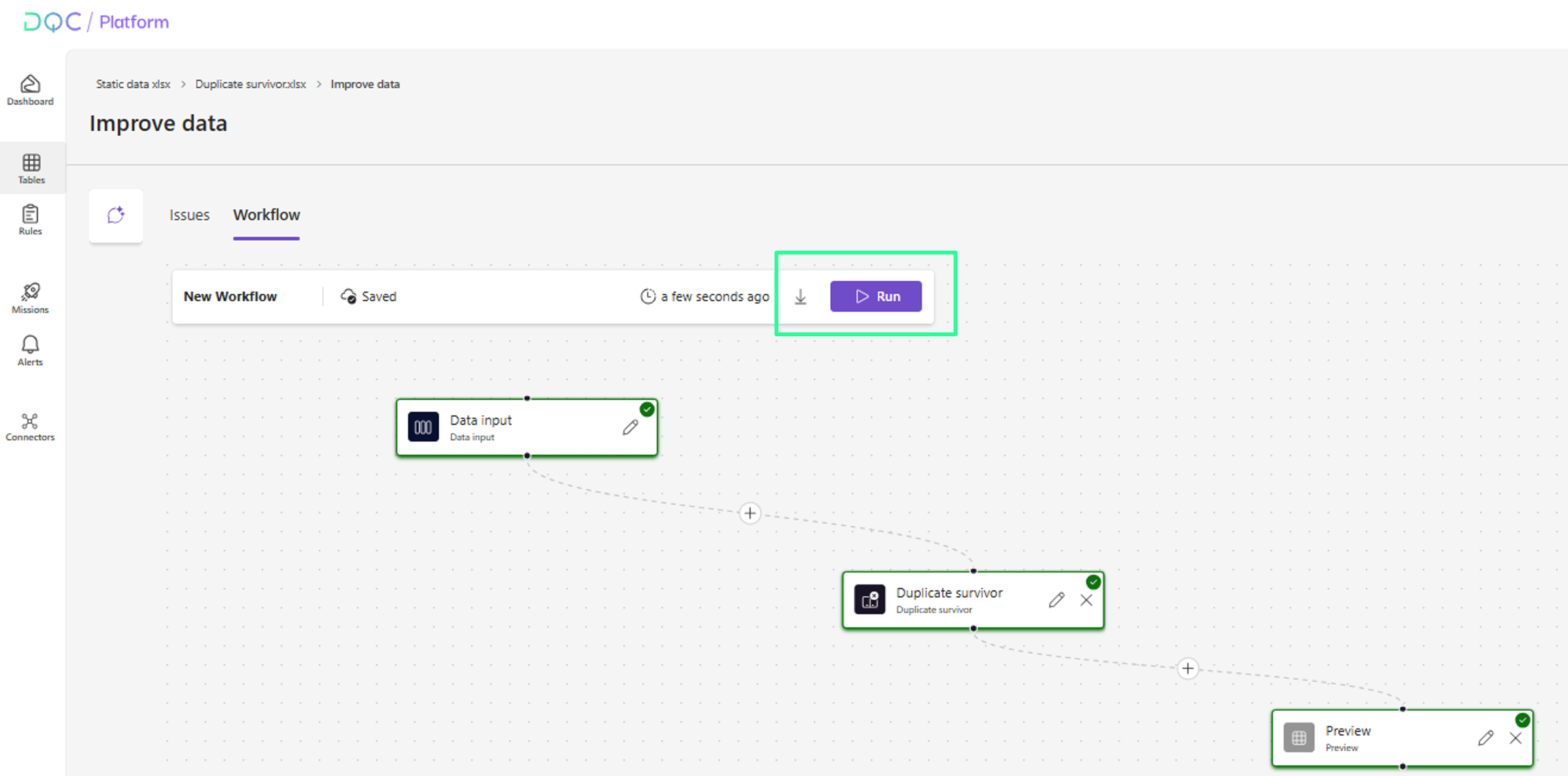 (1) Datei auf der DQC Platform auswählen (aus einem Connector oder einer statischen Datei)