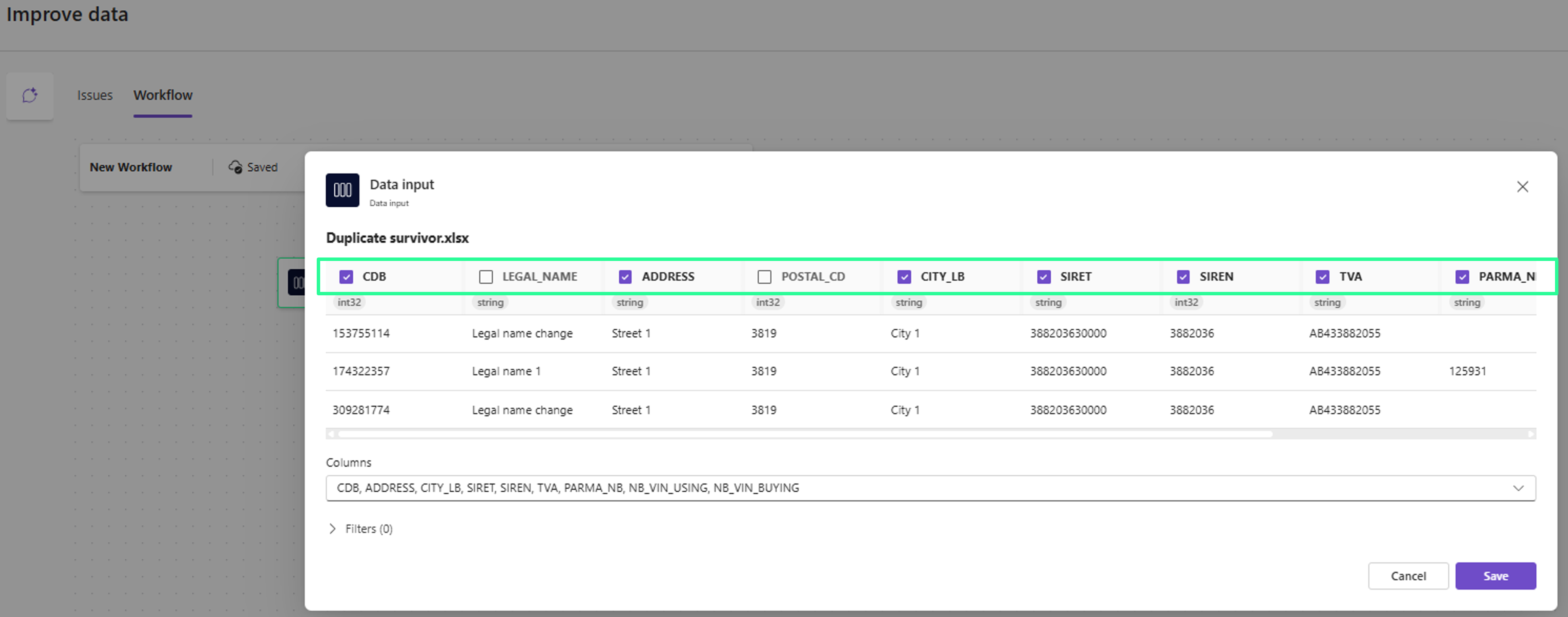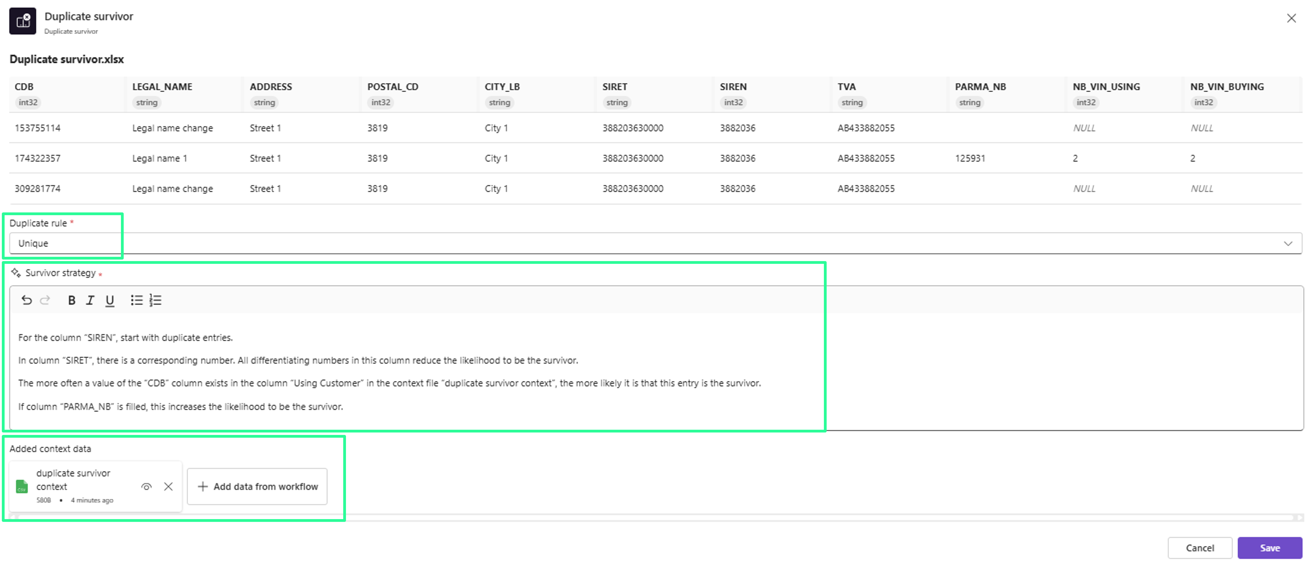Der Duplicate-Survivor-Workflow ermöglicht es, mehrdeutige Duplikate in einer Tabelle zu identifizieren oder aufzulösen. Er verwendet einen agentenbasierten Ansatz, um automatisch den besten Eintrag (den „Survivor“) innerhalb jeder Gruppe potenzieller Duplikate zu bestimmen und markiert alle anderen als Duplikate.