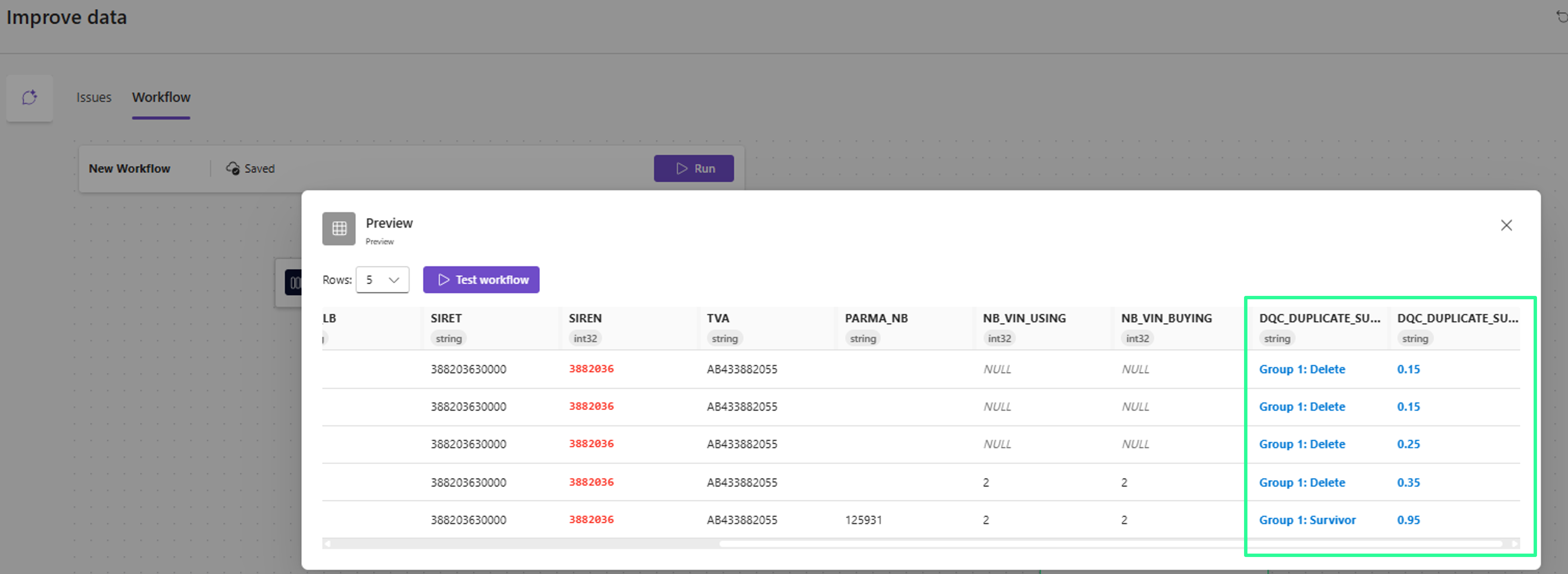 Für den Preview Node: Node öffnen und einen Workflow-Test durchführen (falls die Datei nicht zu viele Einträge enthält). Der Survivor wird angezeigt, inklusive eines Confidence Scores.