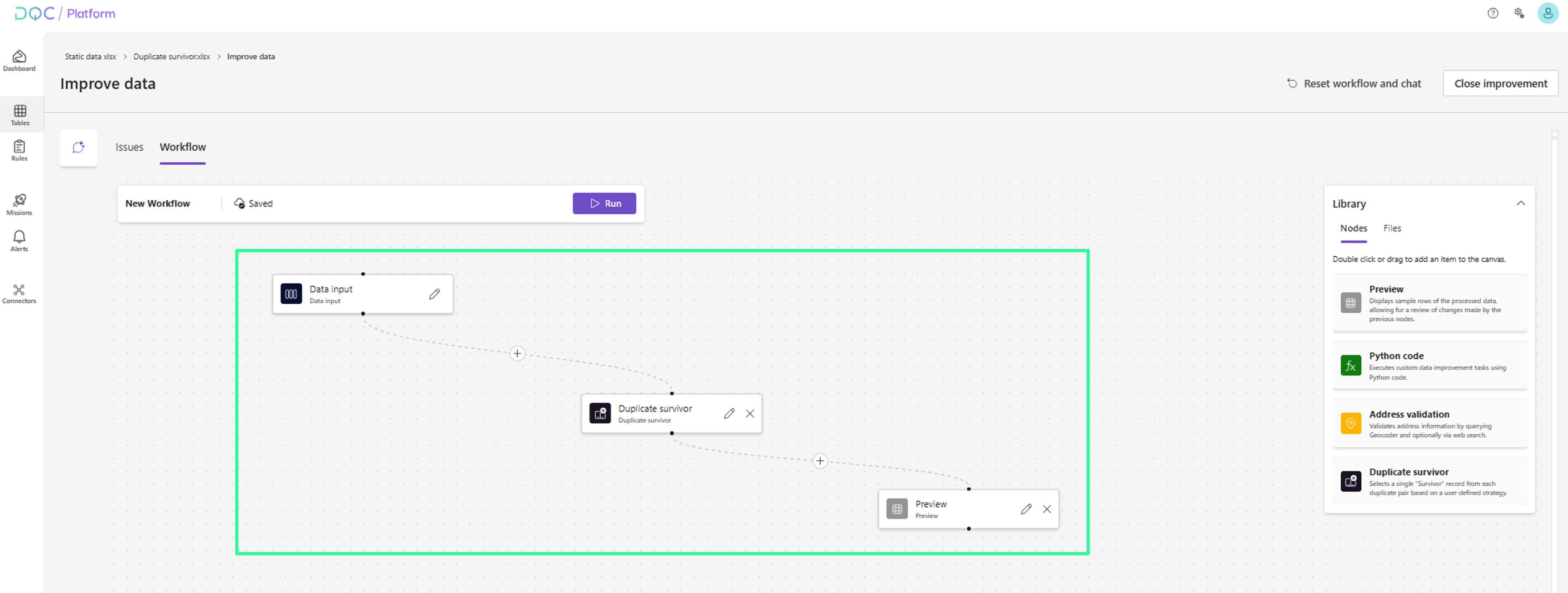 Hier kann ein Workflow bestehend aus „Data input“, „Duplicate survivor“ und „Preview“ eingerichtet werden. Einfach die Nodes aus der Node-Bibliothek auswählen und per Drag-and-Drop hinzufügen.