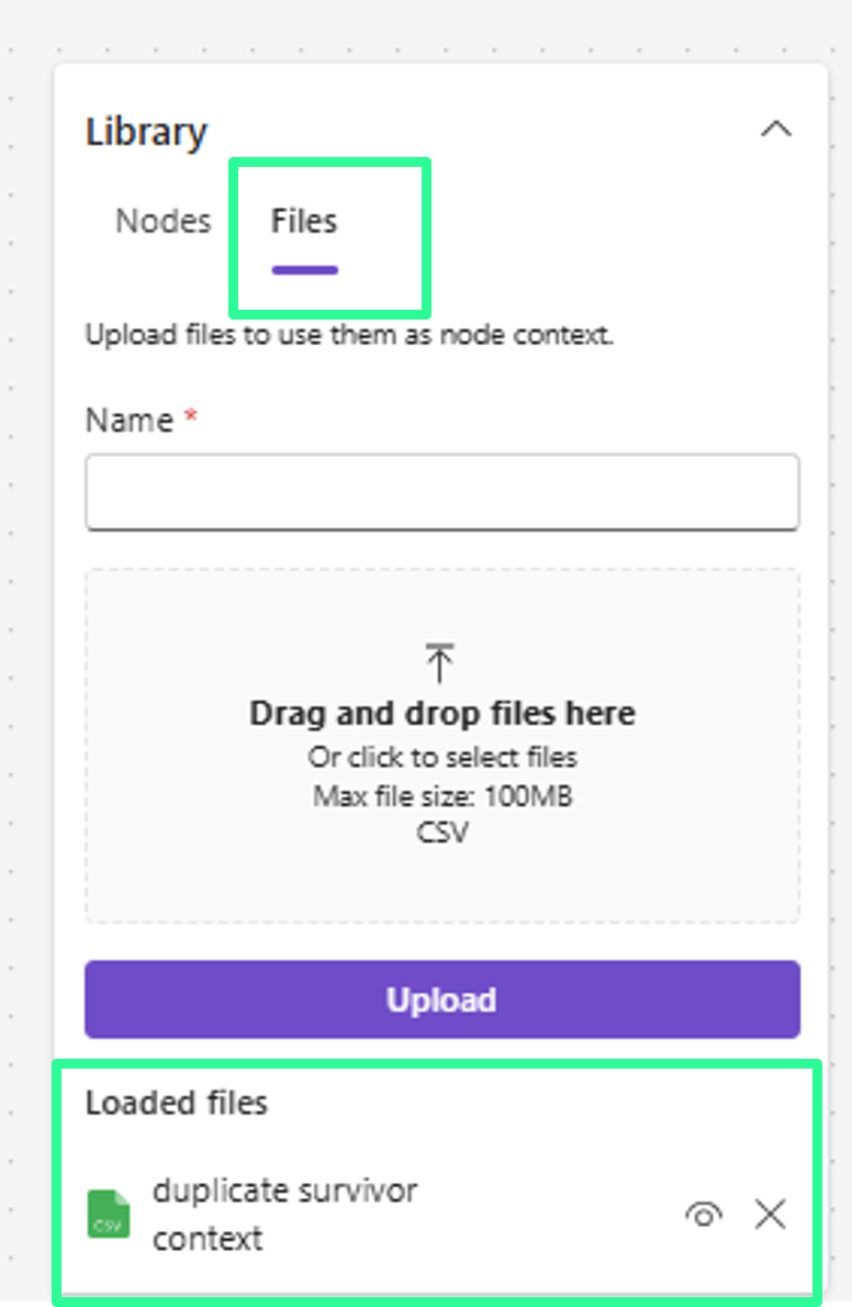 Duplicate survivor Node: Falls relevante Kontextinformationen in einer separaten Datei enthalten sind, kann diese (CSV-Format) hinzugefügt werden. Einfach die Datei in der Bibliothek hochladen.