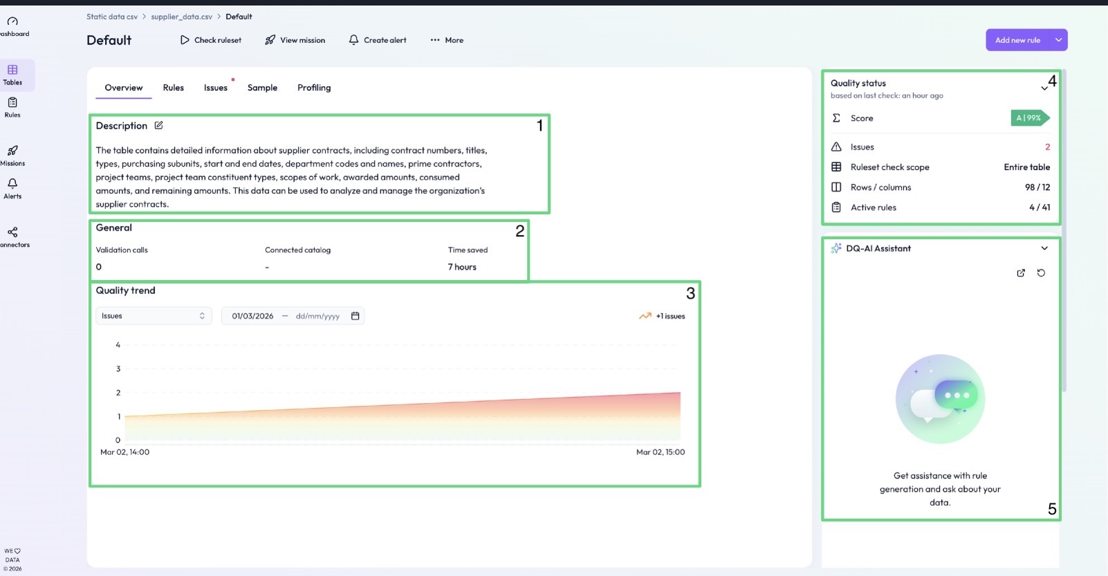 Der Übersichtsbildschirm zeigt eine zentrale Zusammenfassung wichtiger Kennzahlen, Entwicklungen und intelligenter Vorschläge für jede verbundene Tabelle in der DQC Platform.
