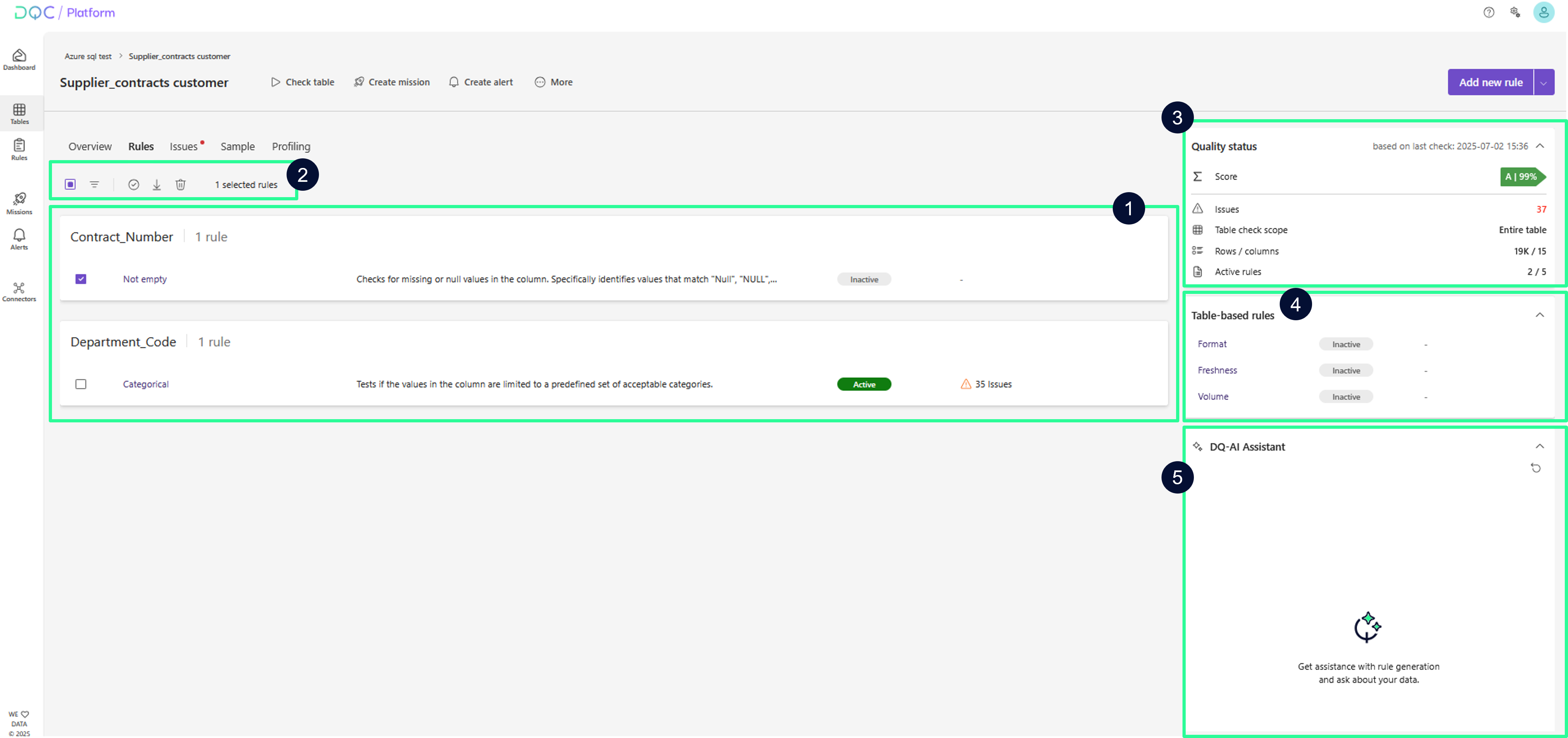 Der Regeln-Tab in der DQC Platform zeigt alle Datenqualitätsregeln, die für eine bestimmte Tabelle definiert wurden. Hier können Regeln aktiviert, verwaltet und neu erstellt werden – manuell oder mithilfe des DQ-AI Assistant.