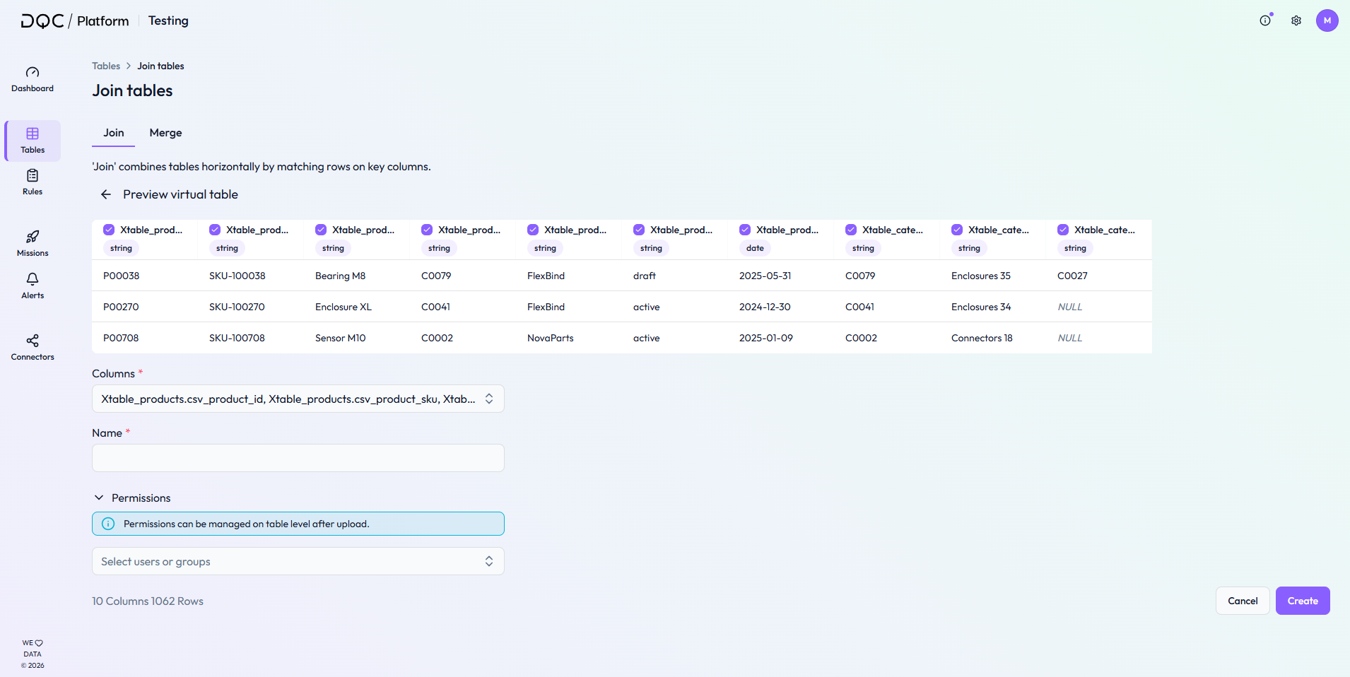 Users can now assign permissions directly while loading static files or creating virtual tables