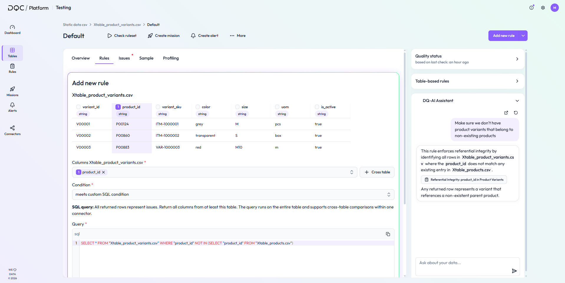 In the screenshot below, the user asks: "Make sure we don’t have product variants that belong to non-existing products." The Assistant responds by generating a cross-table rule that enforces this condition.
