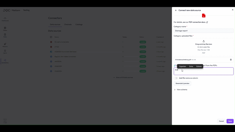 Introduces a prompt field in the PDF connector menu where users can describe in natural language which information should be extracted from PDF files