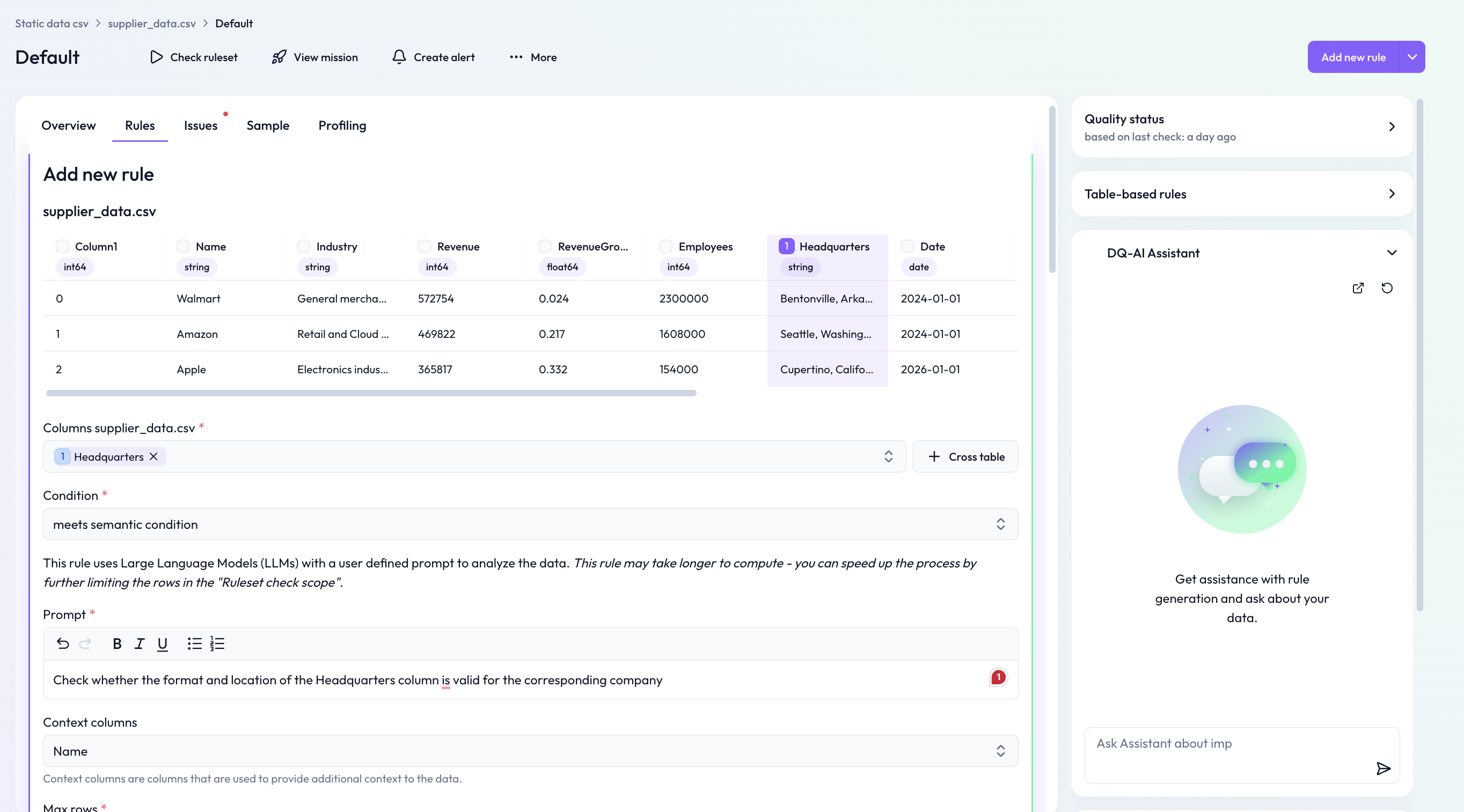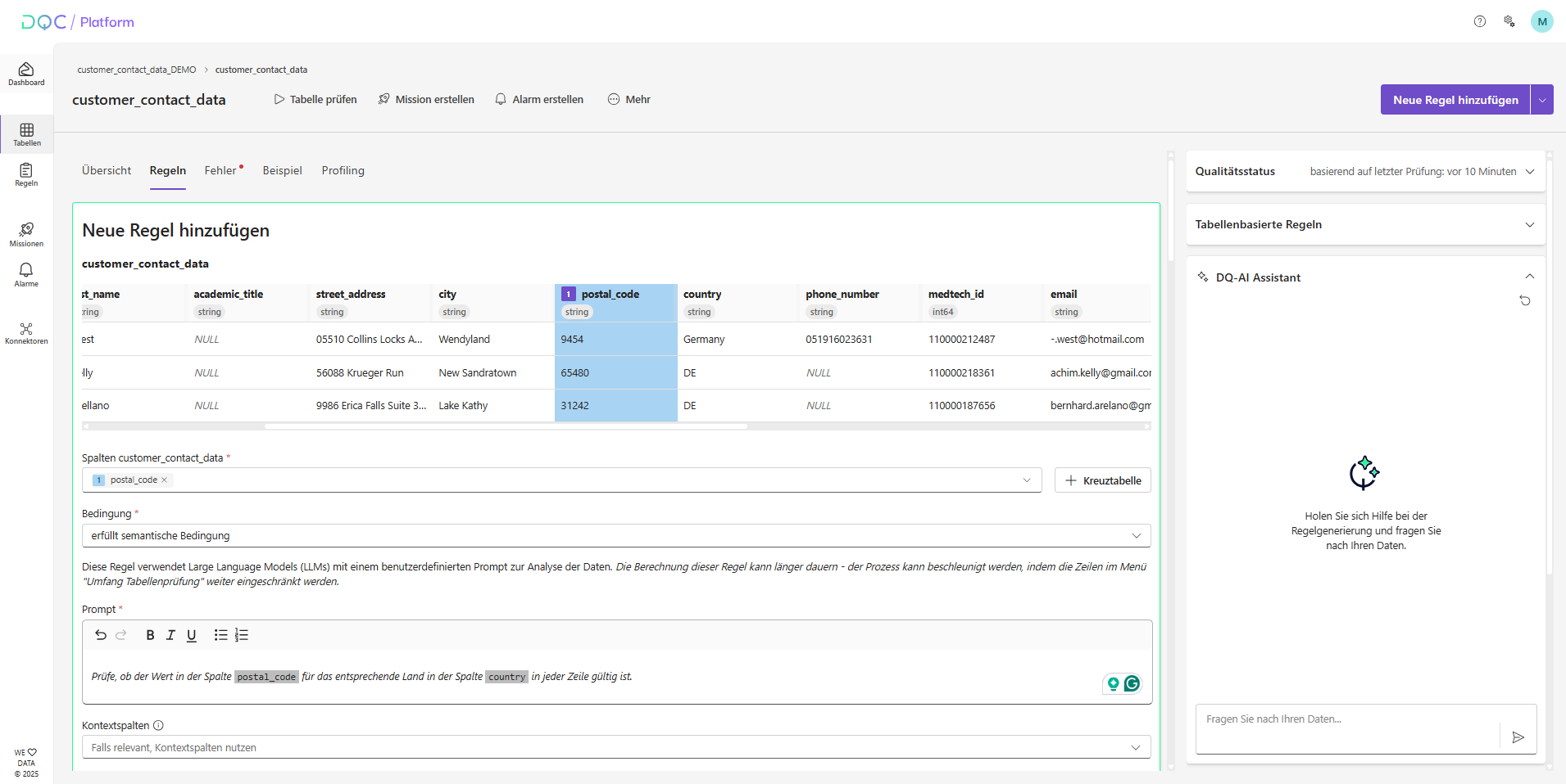 Die semantische Regel ermöglicht es Nutzer*innen, intelligente, LLM-basierte Validierungen auf Spaltenwerte anzuwenden, indem sie die Logik in natürlicher Sprache beschreiben. Sie ist besonders hilfreich für Prüfungen, die externes Wissen oder den Zusammenhang zwischen Spalten erfordern.