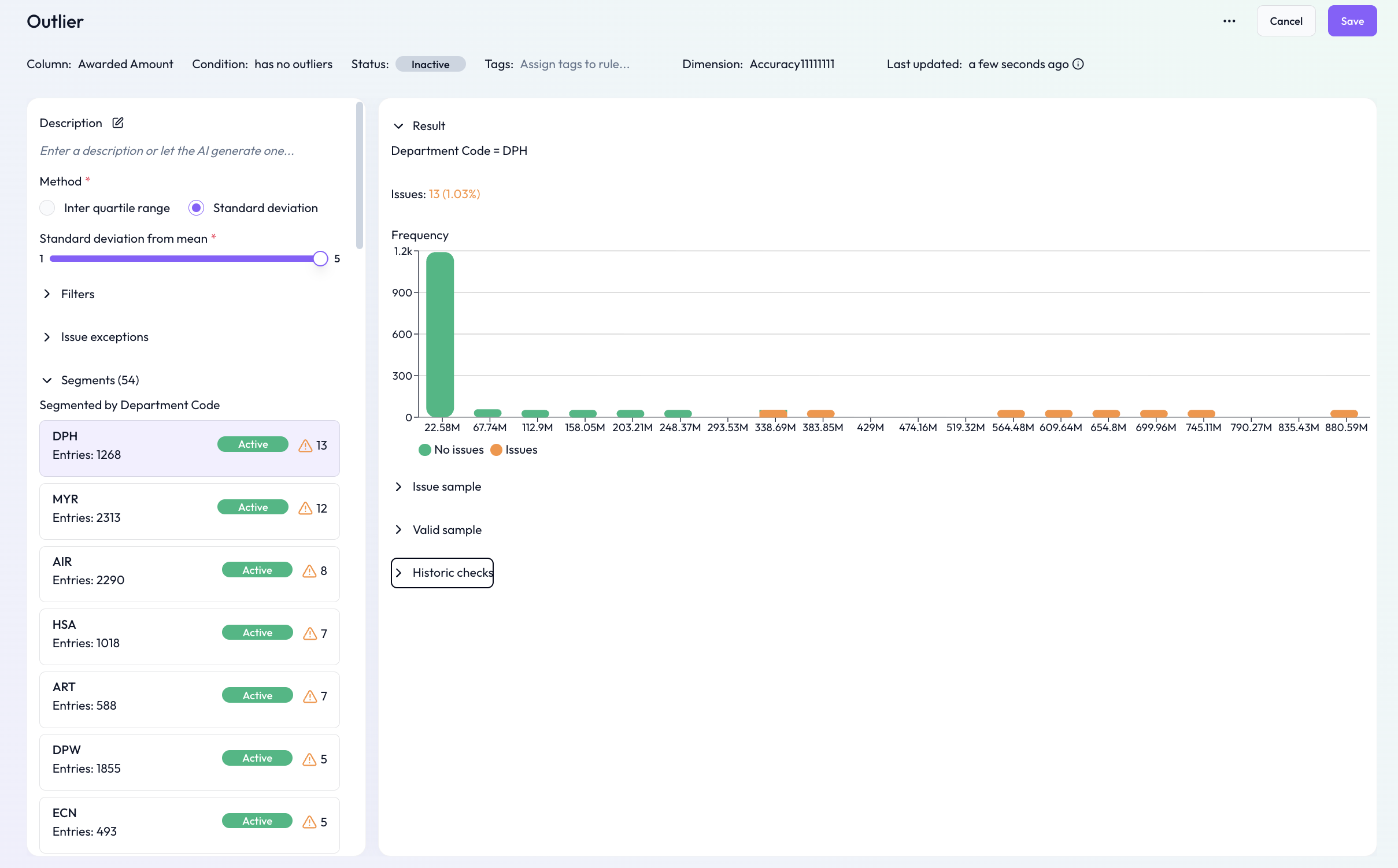 Szenario: Eine „No outlier“-Regel soll auf einen numerischen Wert angewendet werden – die Werte unterscheiden sich jedoch deutlich zwischen Abteilungen.