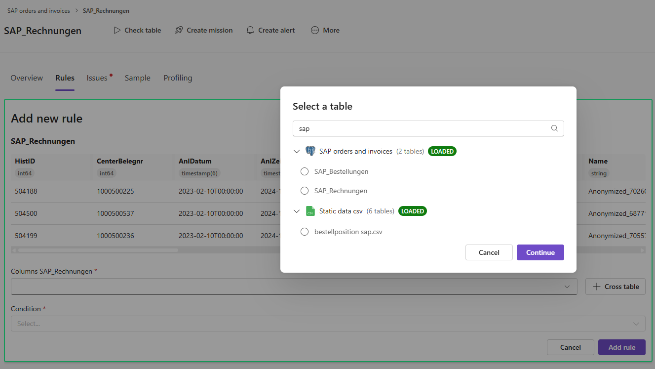Dieser Artikel erklärt, wie eine tabellenübergreifende Datenqualitätsregel erstellt wird, um Werte zwischen zwei unterschiedlichen Tabellen zu vergleichen. Diese Funktion ist hilfreich, wenn Daten in einer Tabelle mit einer anderen Tabelle übereinstimmen oder auf sie referenzieren müssen – zum Beispiel zur Sicherstellung konsistenter Codes, Identifikatoren oder Zeilenanzahlen.