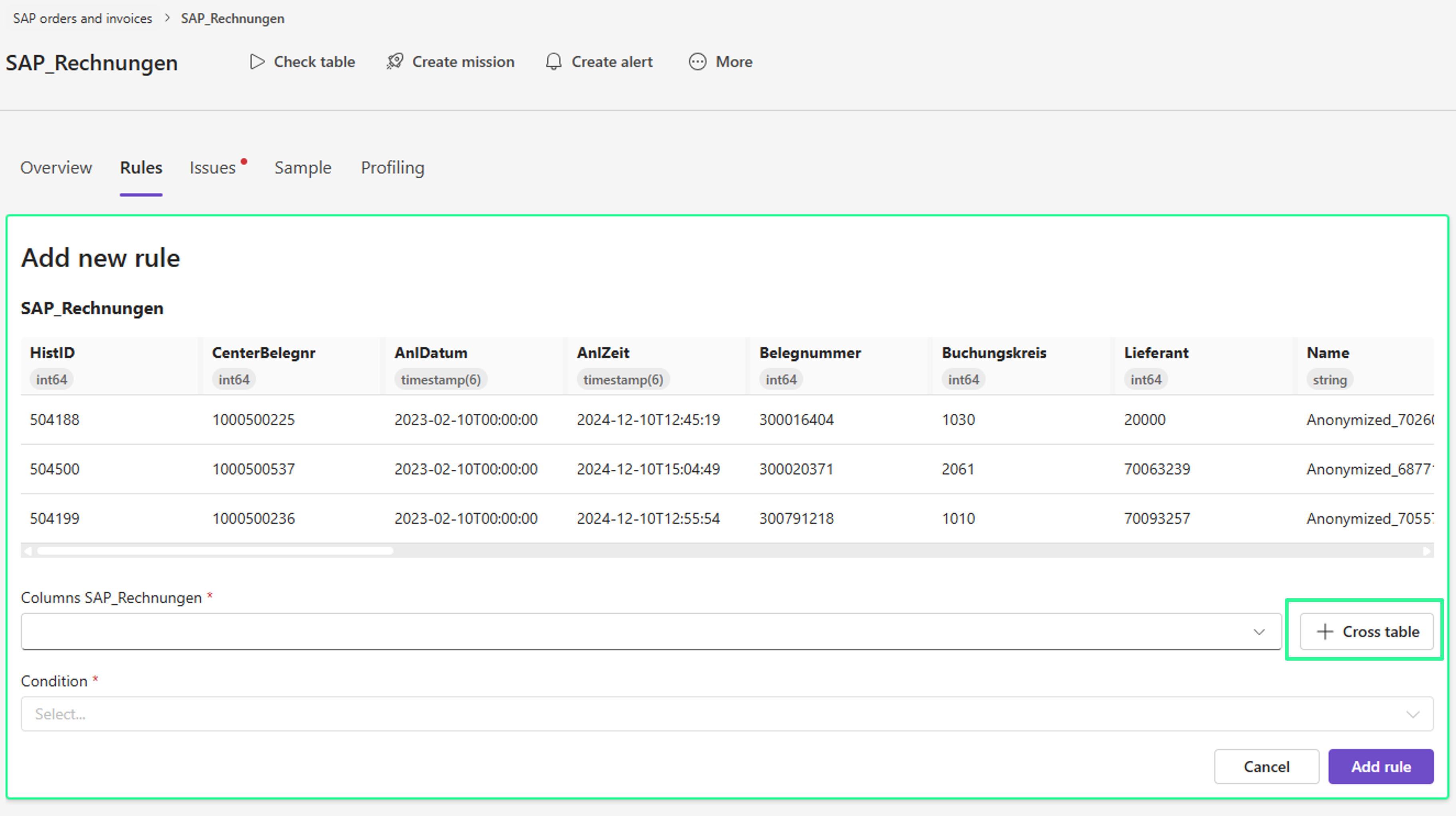 Klicke auf „Regel hinzufügen“, um die tabellenübergreifende Regel zu speichern.
