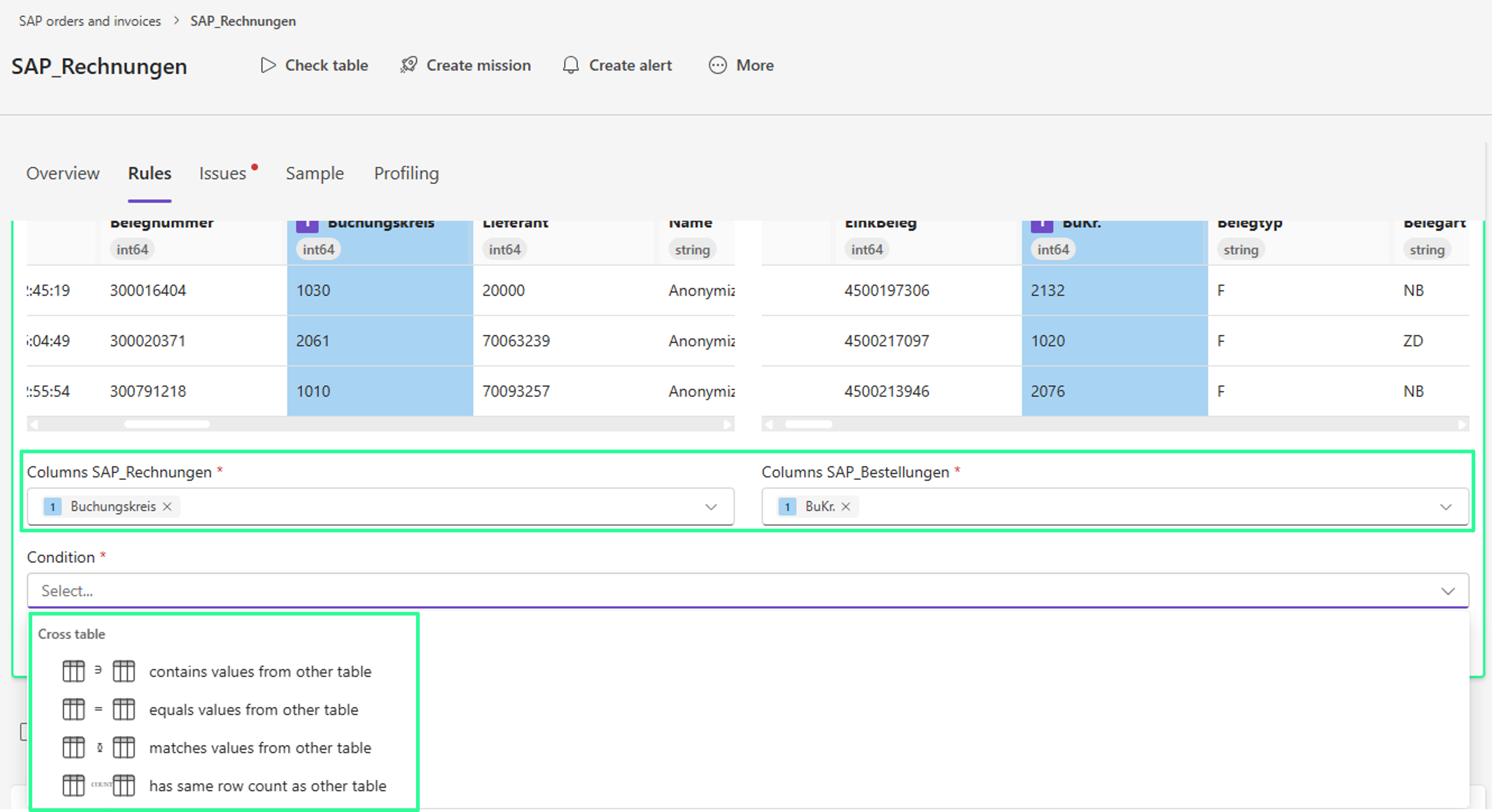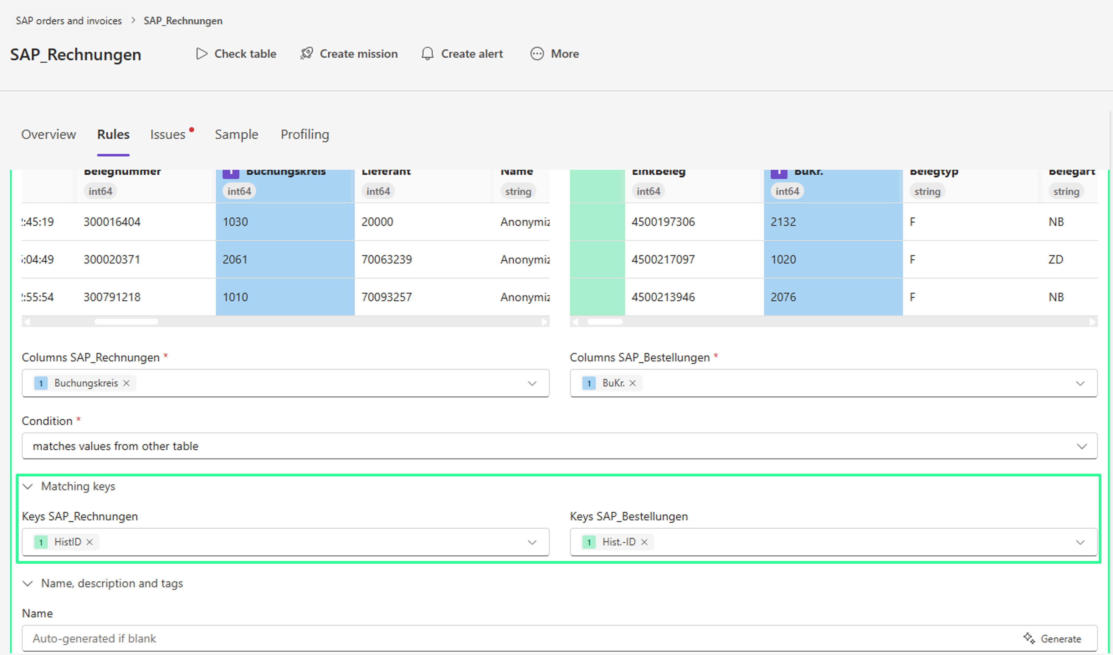 Für die Bedingung „stimmt mit Werten aus anderer Tabelle überein“ müssen in beiden Tabellen Vergleichsschlüssel definiert werden.