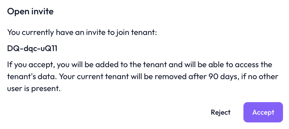 Eingeladene Nutzer erhalten eine E-Mail und sehen nach dem Login ein Popup, um dem Tenant beizutreten