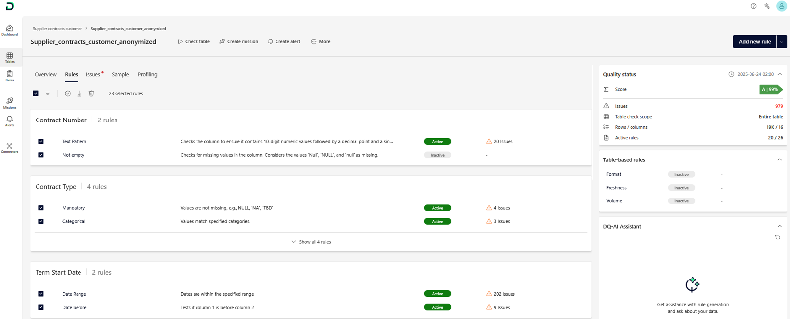 Datenqualitätsregeln lassen sich automatisch oder manuell passend zu den Datentabellen erstellen. Die DQC Platform schlägt mithilfe von KI geeignete Regeln vor, die überprüft und aktiviert werden können. Dabei ist es möglich: