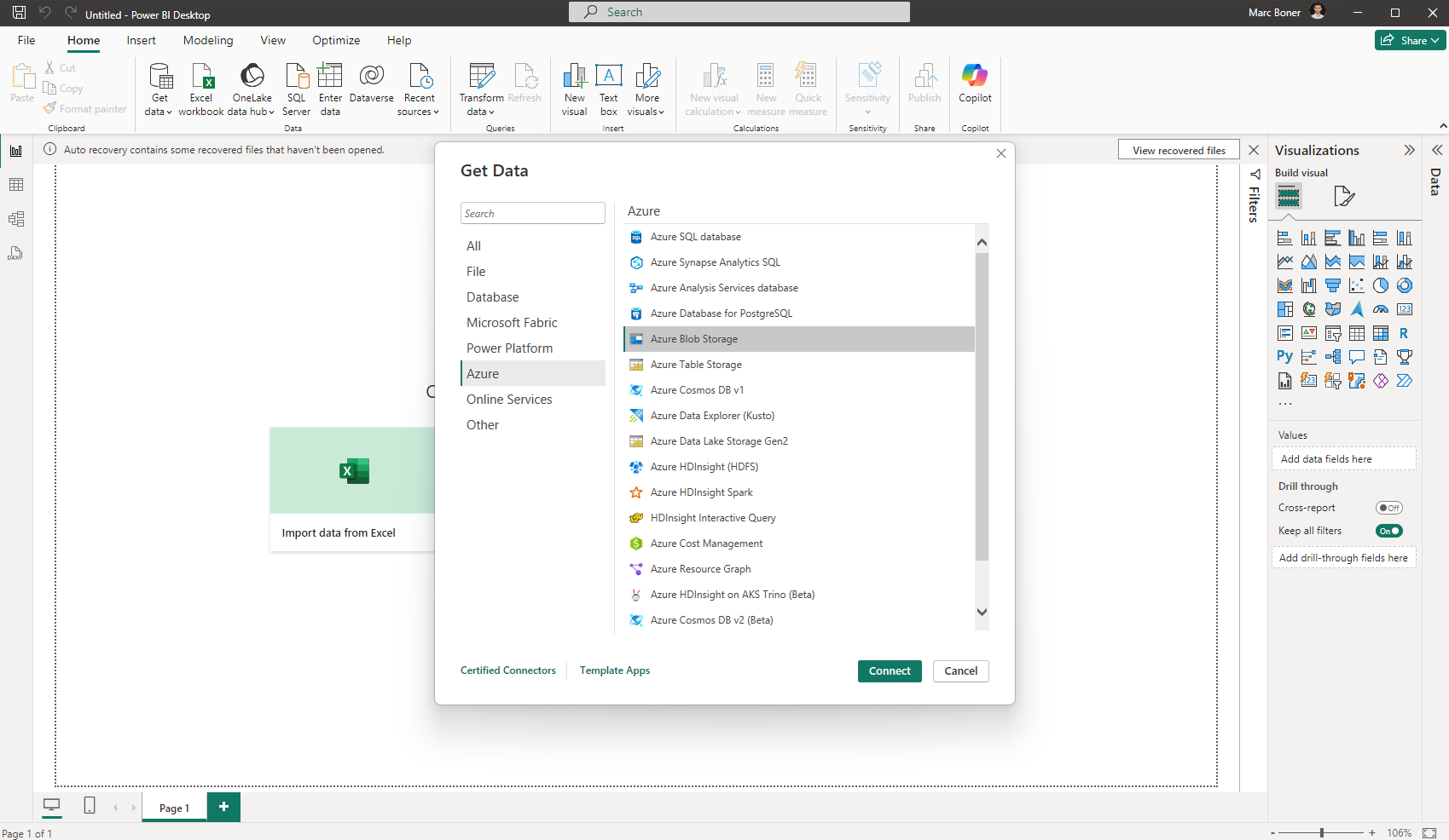 Click Get data → More → Azure → Azure Blob Storage → Connect