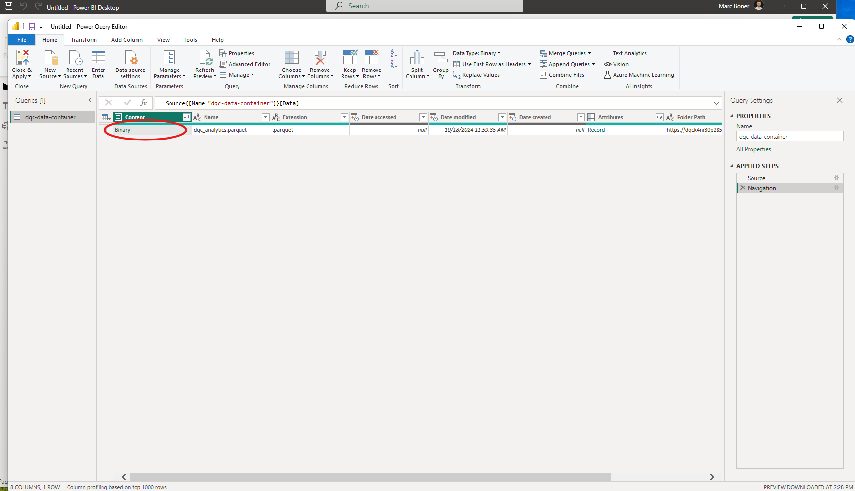 In the Power BI overlay, click on Binary in the first row to unpack the data.