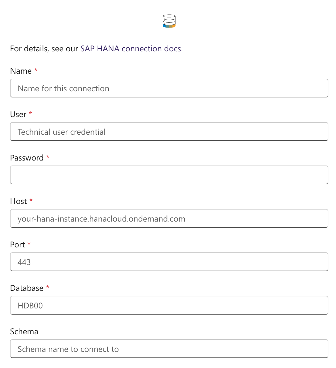 | Either hostname (URL) or IP address of the HANA DB |