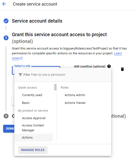 Add the following three roles under product “BigQuery”: