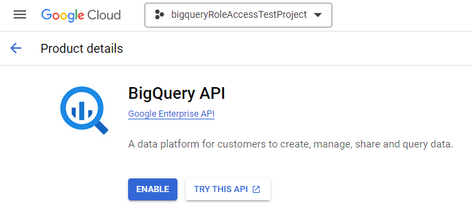 Search for “BigQuery API” in the GCP console and click Enable