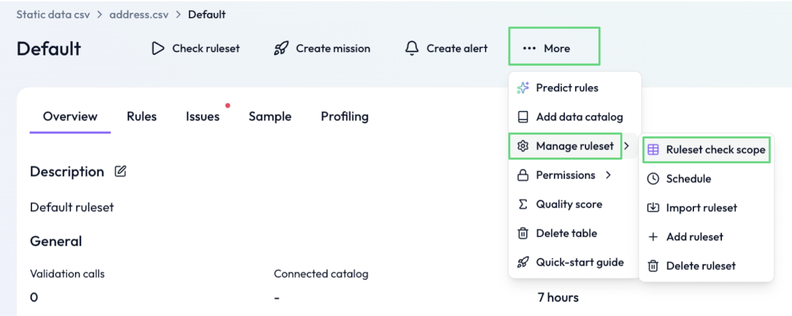 Click “More” → “Manage ruleset” →"Ruleset check scope"