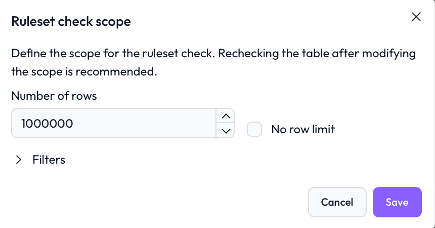 By default, a ruleset check is based on a sample of 1,000,000 rows from the dataset. This ensures performance efficiency, especially for very large tables.