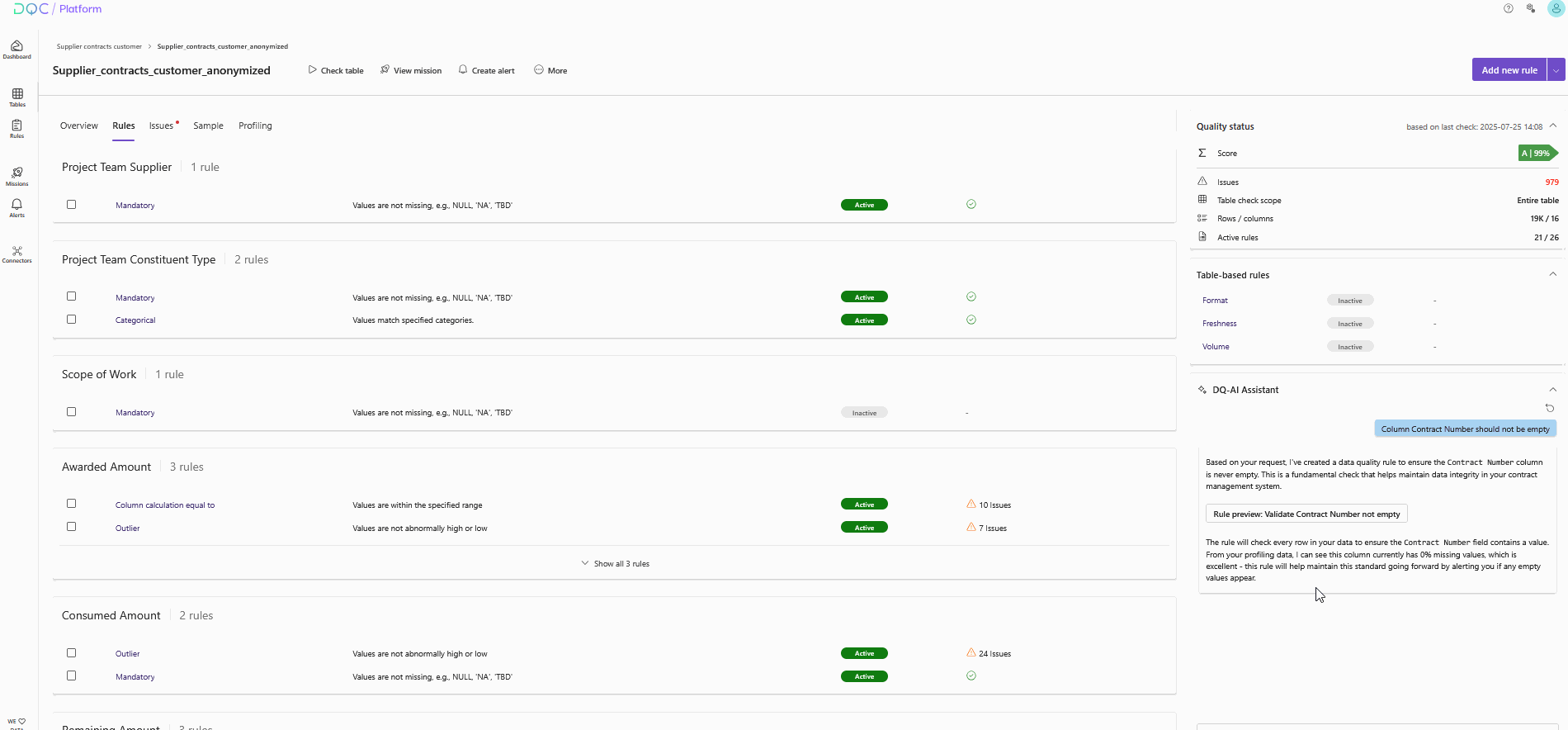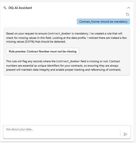 The DQ-AI Assistant is always visible on the right-hand side of the screen. It allows you to create rules by typing in a natural-language prompt.