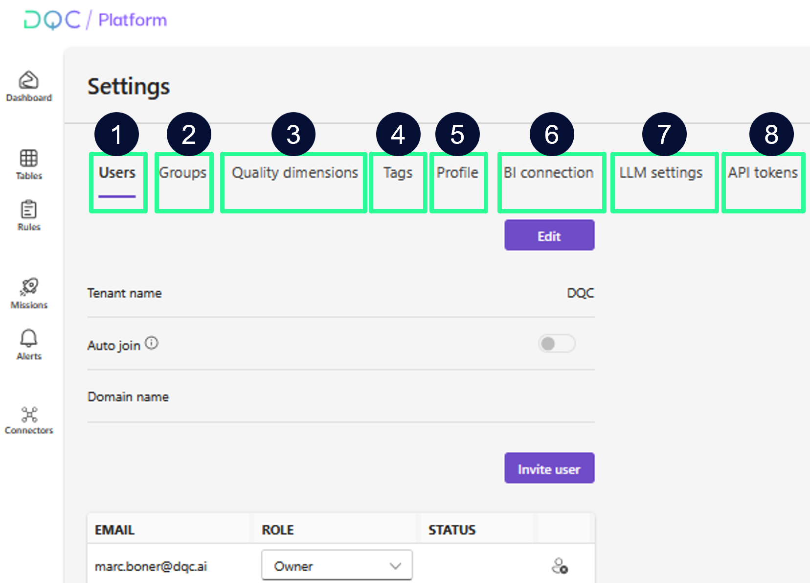 The Settings section in the DQC Platform lets you manage users, access, and advanced platform configurations such as BI connections and LLM settings.