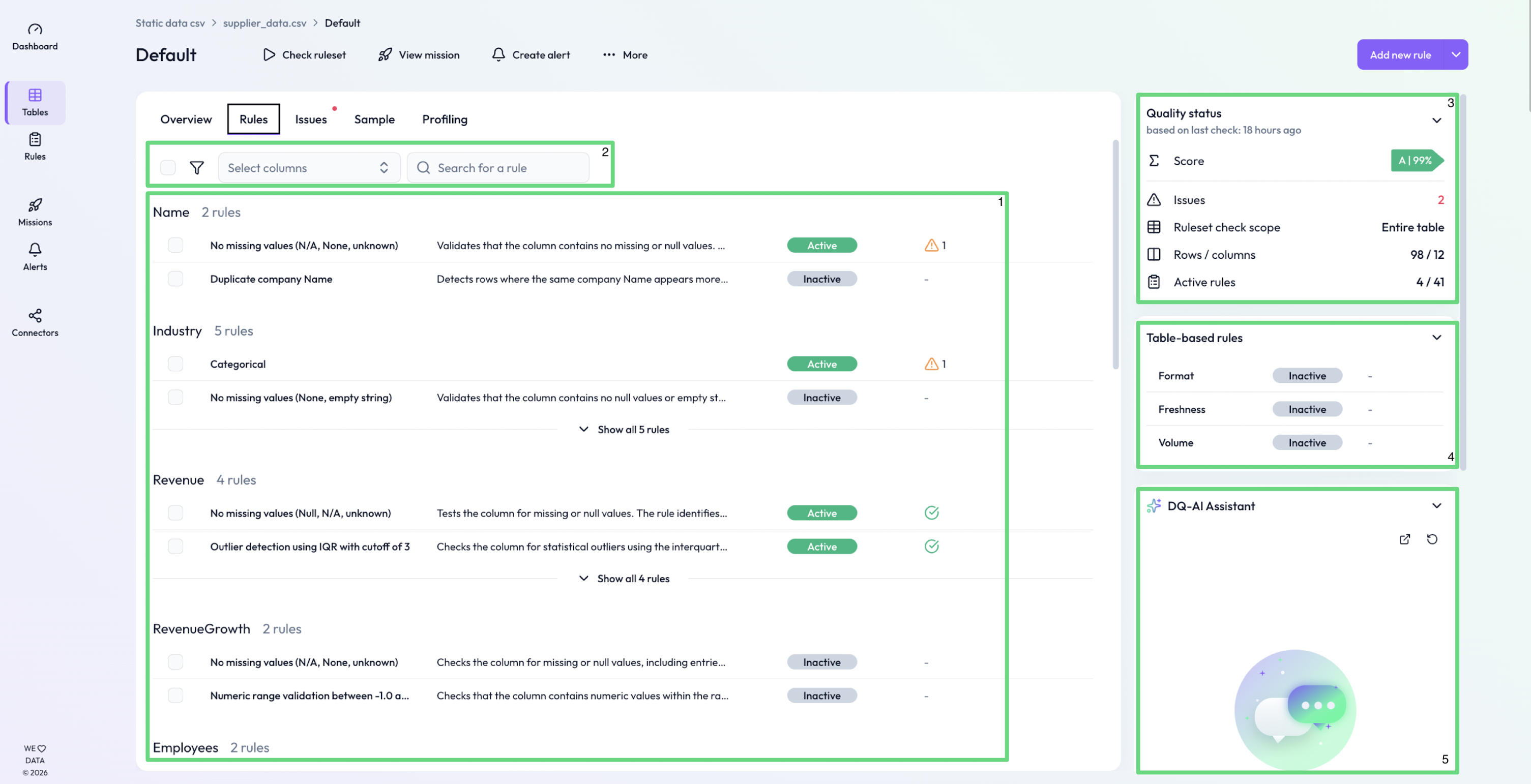 The Rules tab in the DQC Platform provides an overview of all data quality rules defined for a specific table. It allows users to activate, manage, and create rules—either manually or with the help of the DQ-AI Assistant.