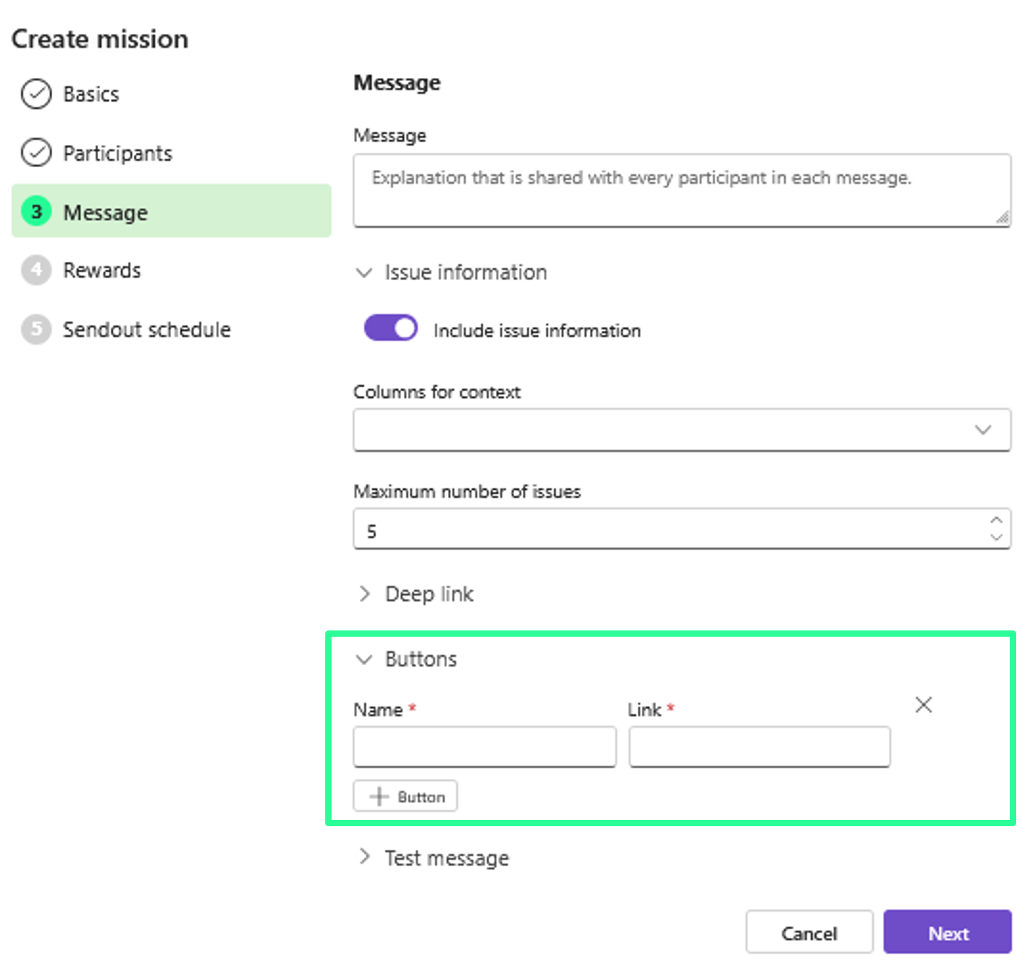 In the DQC Platform, buttons can be added to mission messages to provide recipients with quick access to external tools, issue-resolution platforms, or context-specific resources. This enhances the usability of missions and streamlines the issue resolution process.