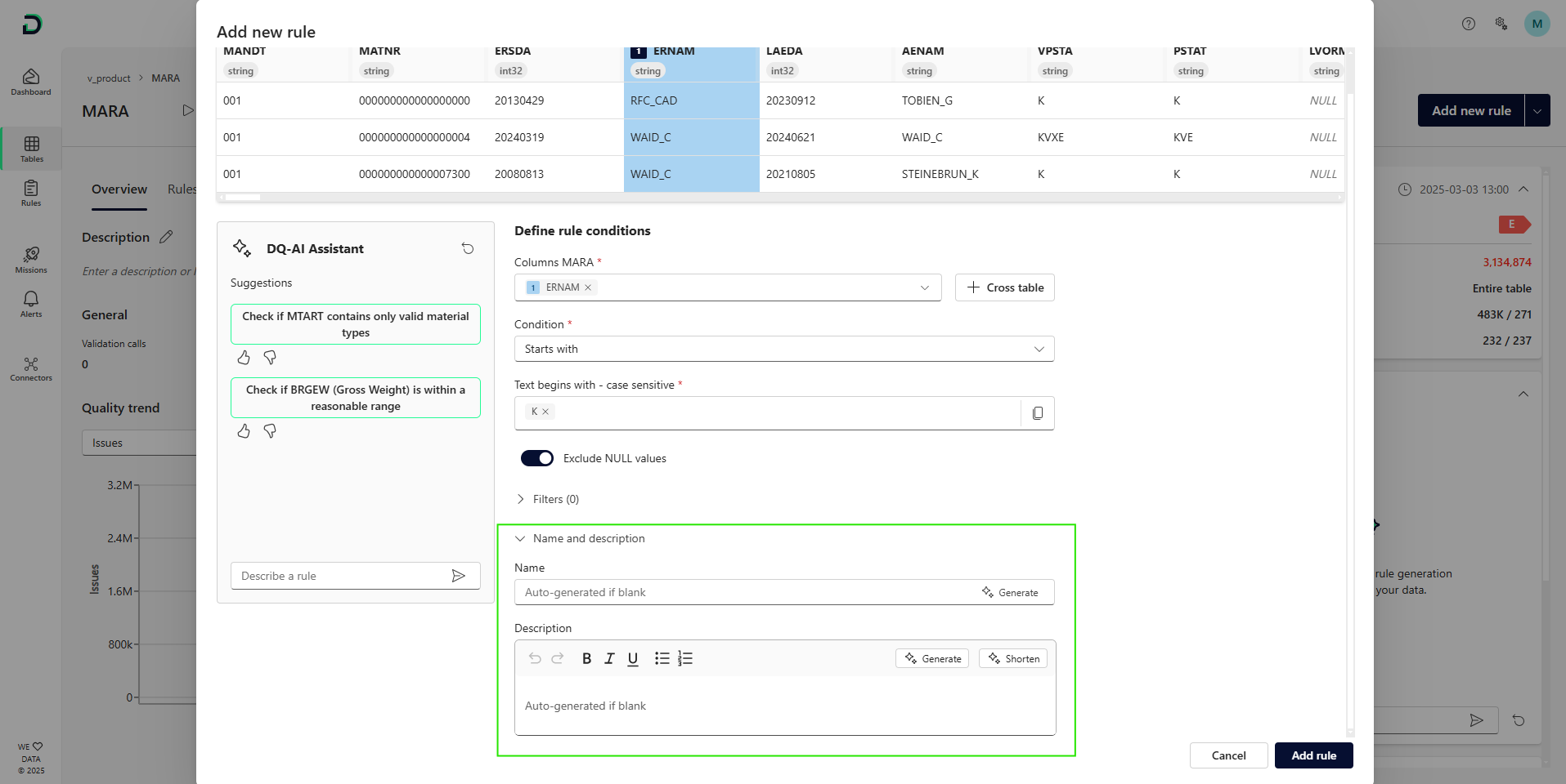 Rule name and description: it is now possible to assign the name and description of the rule already during the creation. After selecting the condition, you can optionally enter name/description yourself or use AI to get a suggestion. If you leave the name and description field blank, we will automatically assign a rule name.