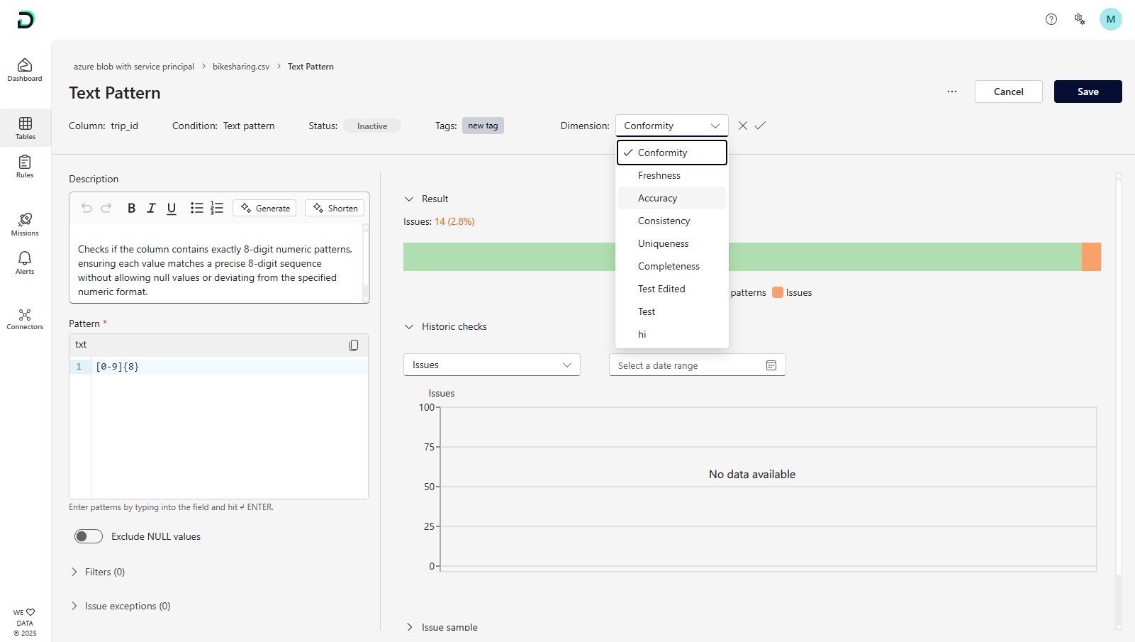 Configurable Data Quality Dimensions: Global mappings from Settings still pre-fill quality dimensions for new rules, but you can now override the dimension for any rule directly in its detail view when the default isn’t a perfect fit.