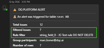 Rule filter information for mission and alert messages: When a rule filter was selected in a mission or alert, we will now also include this information in the message that is sent to users (Email, MS Teams chat, MS Teams channel), including the information how many issues belong to these filtered rules. Example from a Microsoft Teams message: