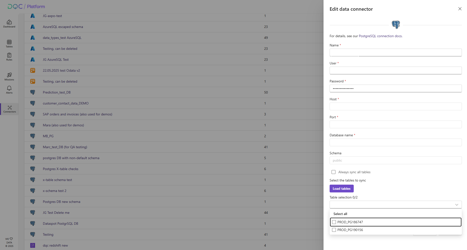 Before establishing a connection, simply load the overview of available tables and select the ones you want to connect to the DQC Platform.