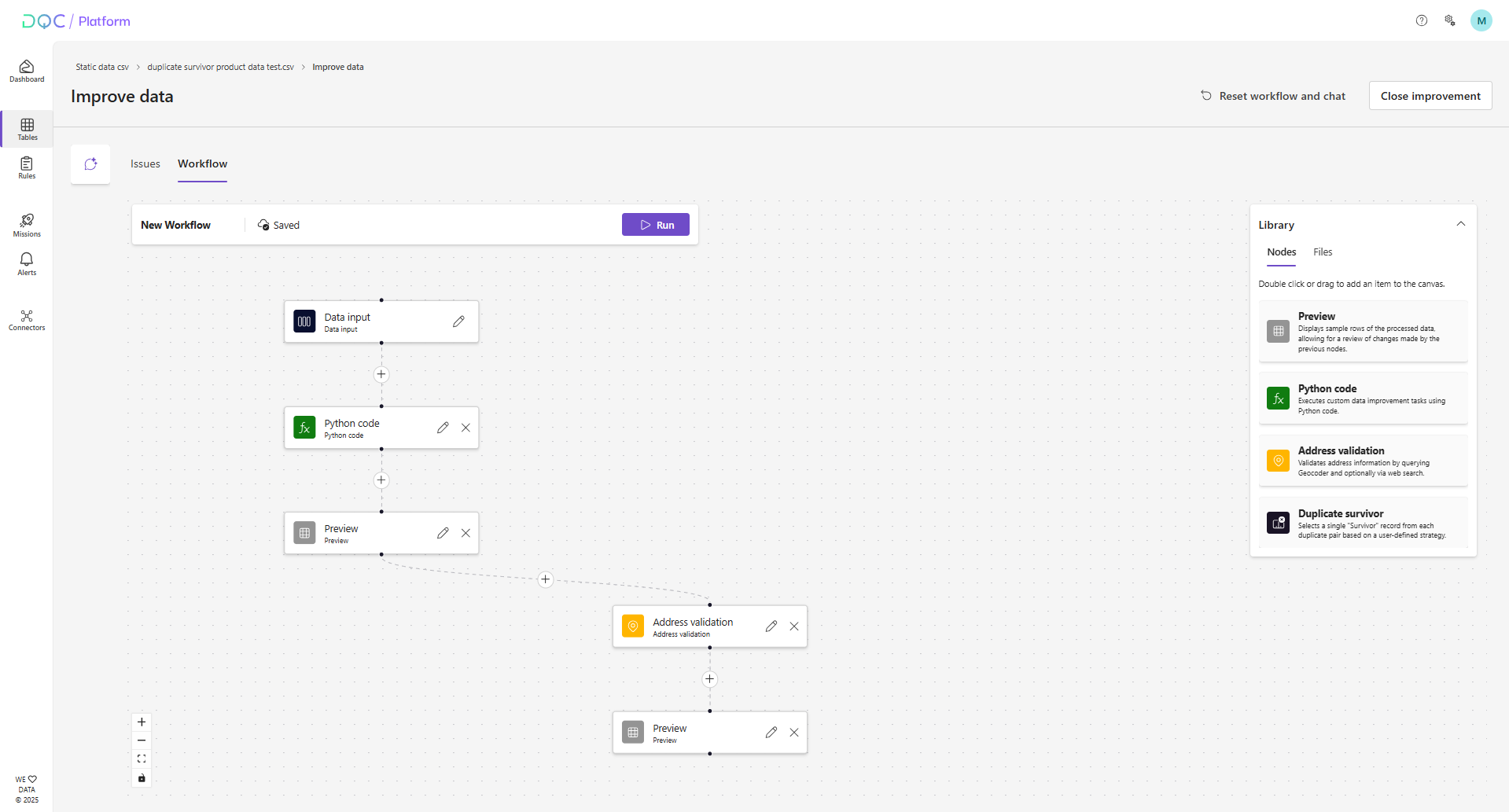Once your workflow is ready, simply click Run to execute it and export the improved data as a CSV file. This output can be used, for example, to replace incorrect rows in your source system.
