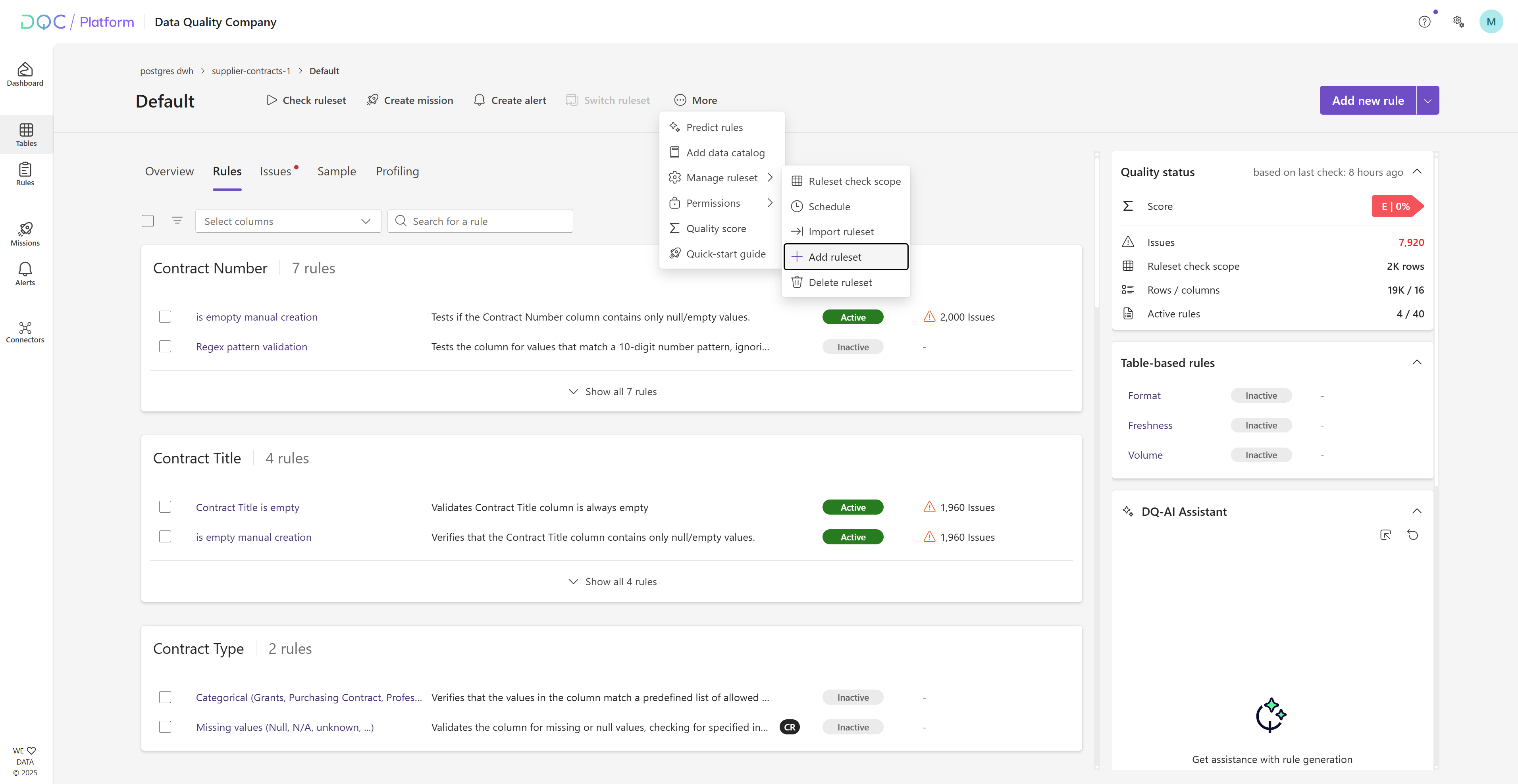 Independent metrics and governance – Each ruleset has its own KPIs, issue statistics, quality scores, and audit trail