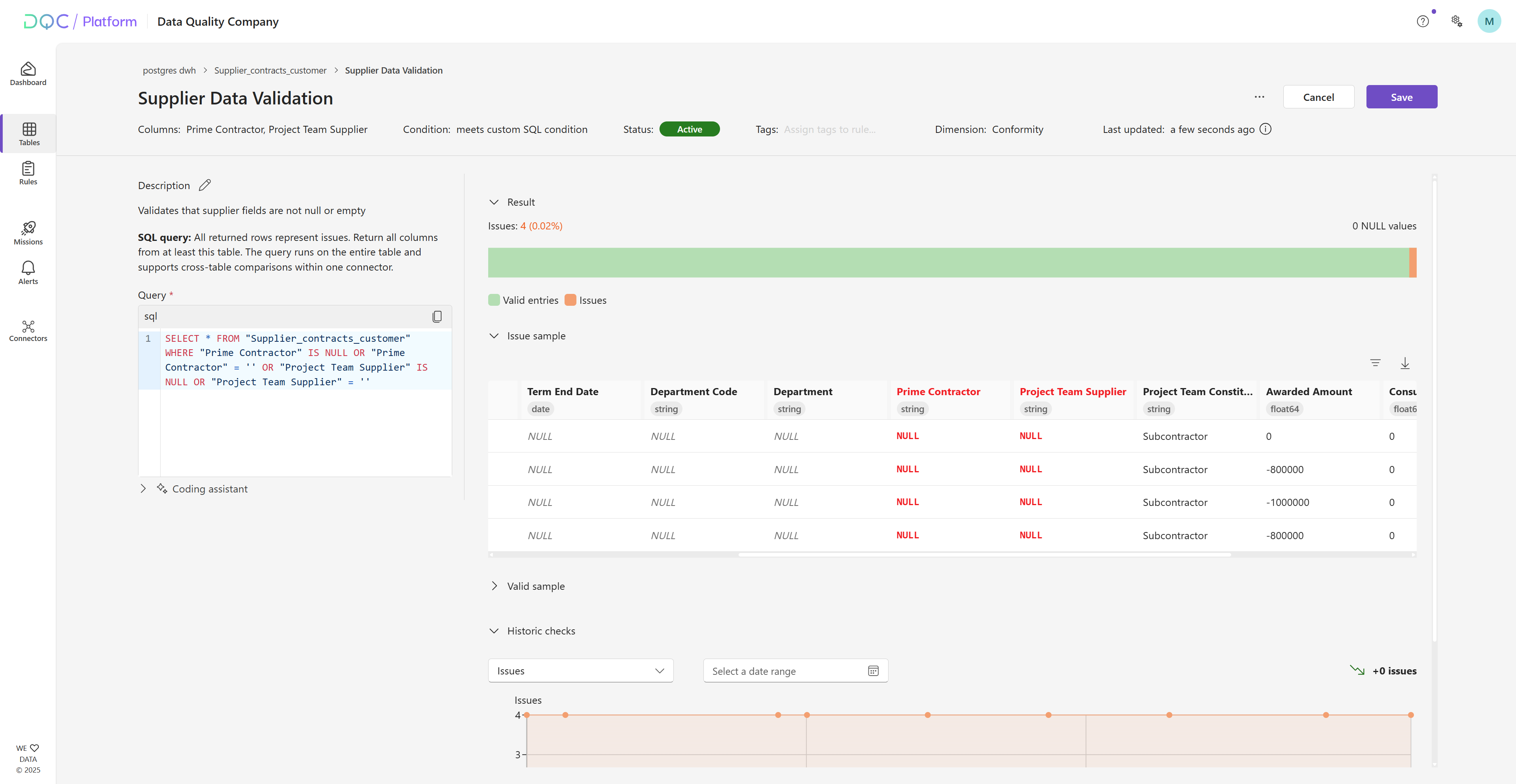 When you change a rule’s configuration, the "Update" preview bar now sits at the top and refreshes all four panels on the right: Result chart, Historic checks, Issue sample, and Valid sample. Previously, only the Result chart updated; now you can immediately see updated issue counts alongside new example rows.