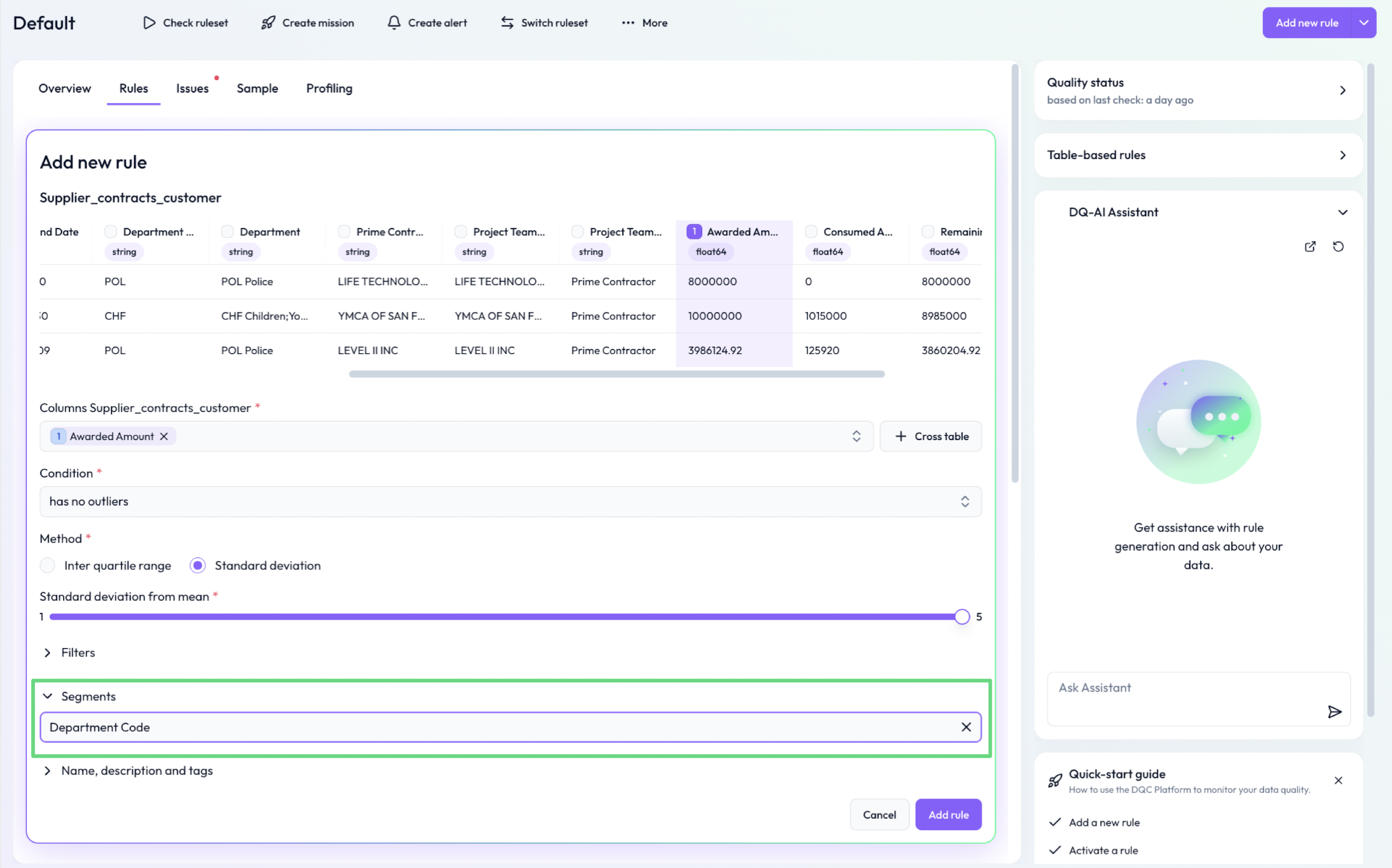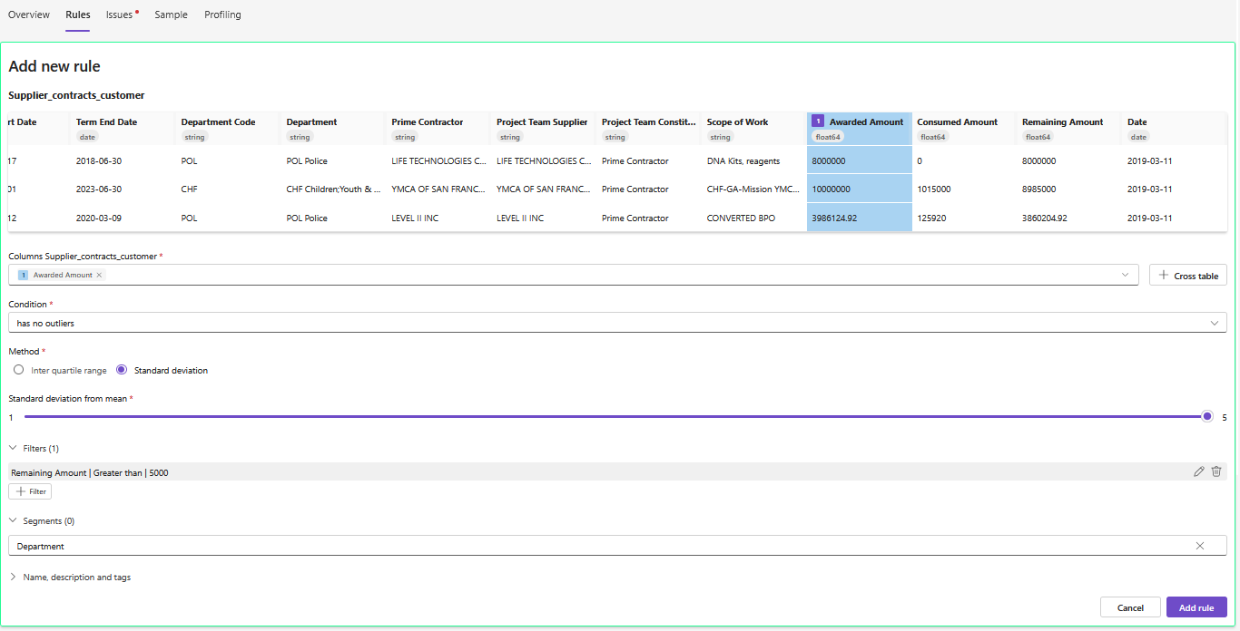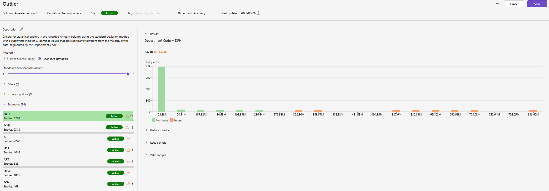 Scenario: You want to apply a “No outlier” rule to a numeric field, but values vary widely across departments.
