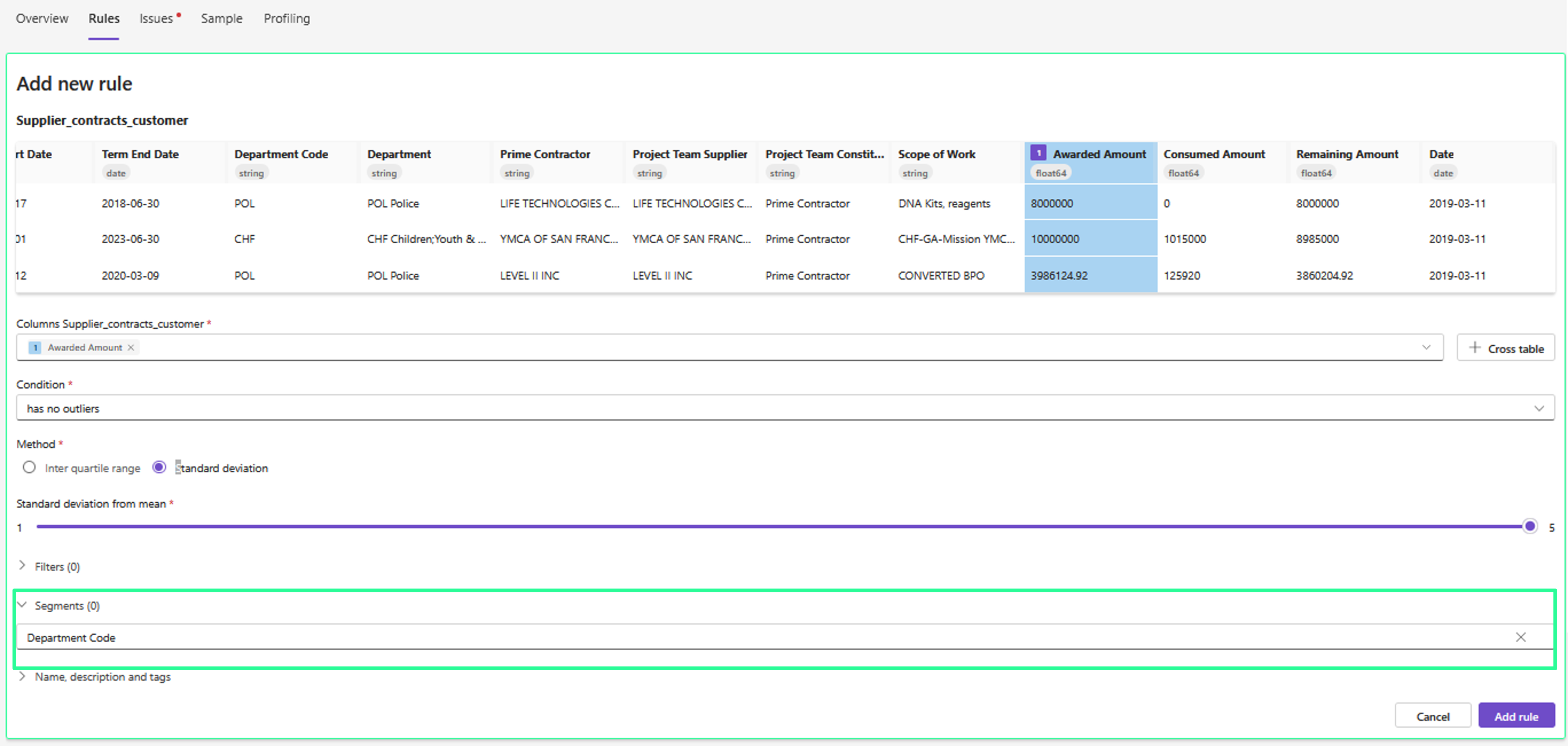 The rule now checks for outliers within each department, not across all rows