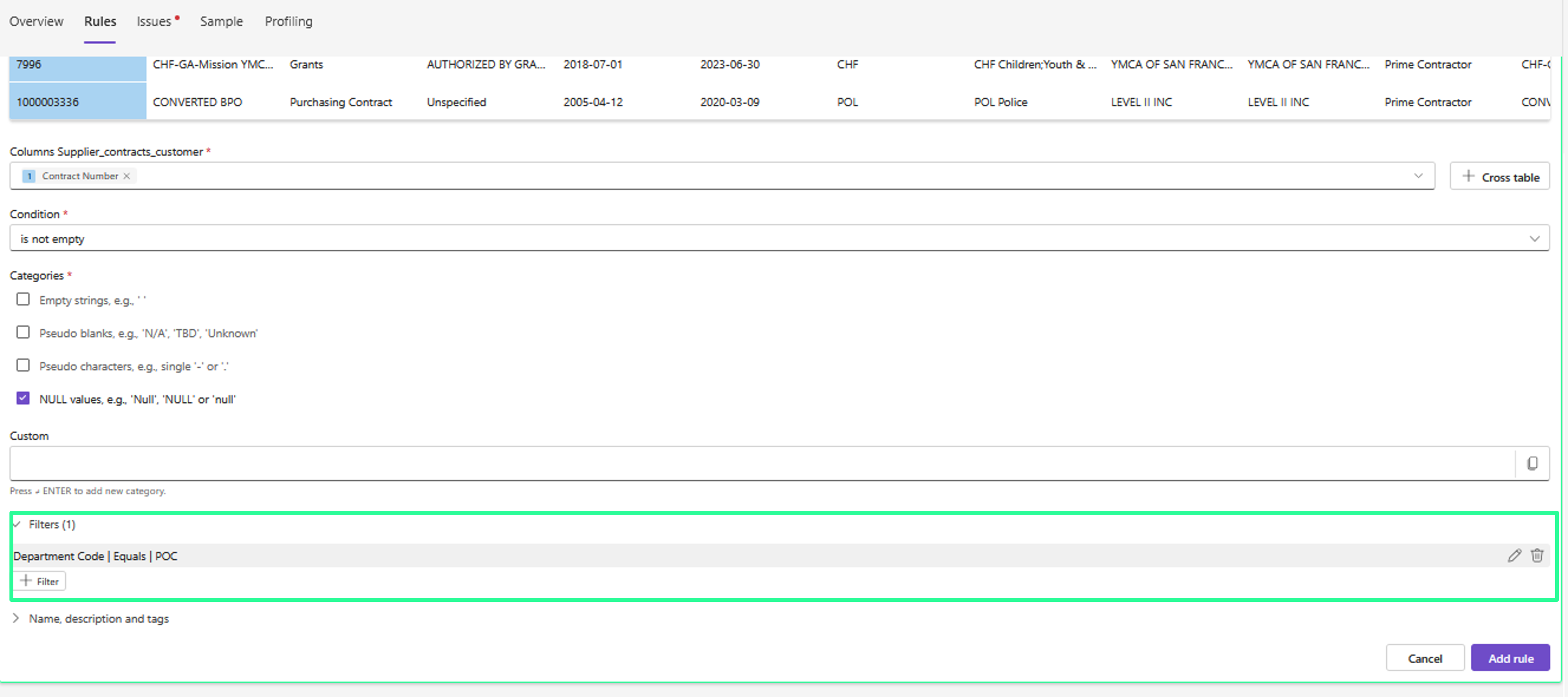 This method is ideal for straightforward checks like “Not empty,” “Greater than,” or “Starts with.” Or to directly enter SQL code.
