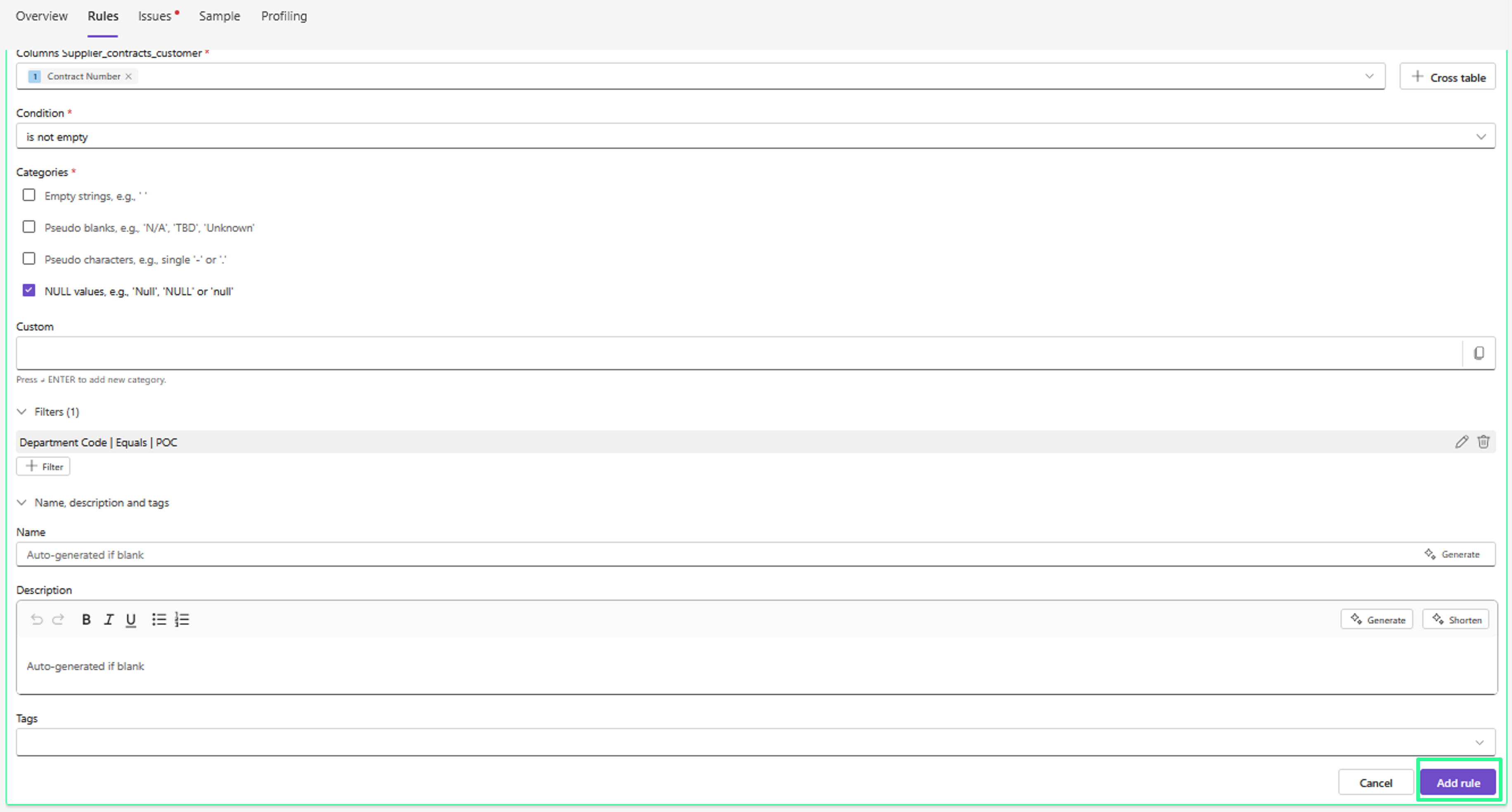 Learn more: Overview of existing rules, Rule creation with AI, Using filters