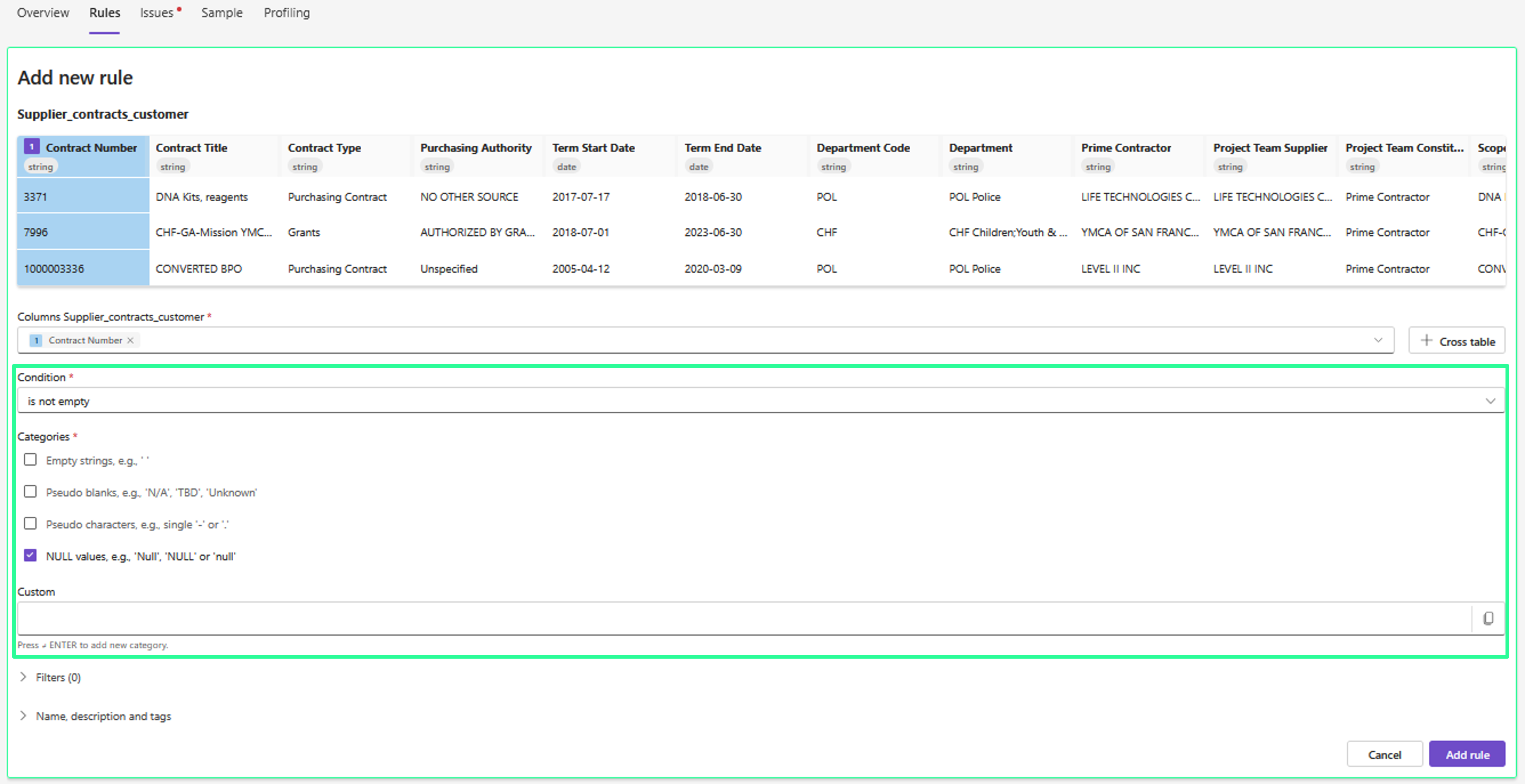 For multi-column rules, select two or more columns (if applicable).