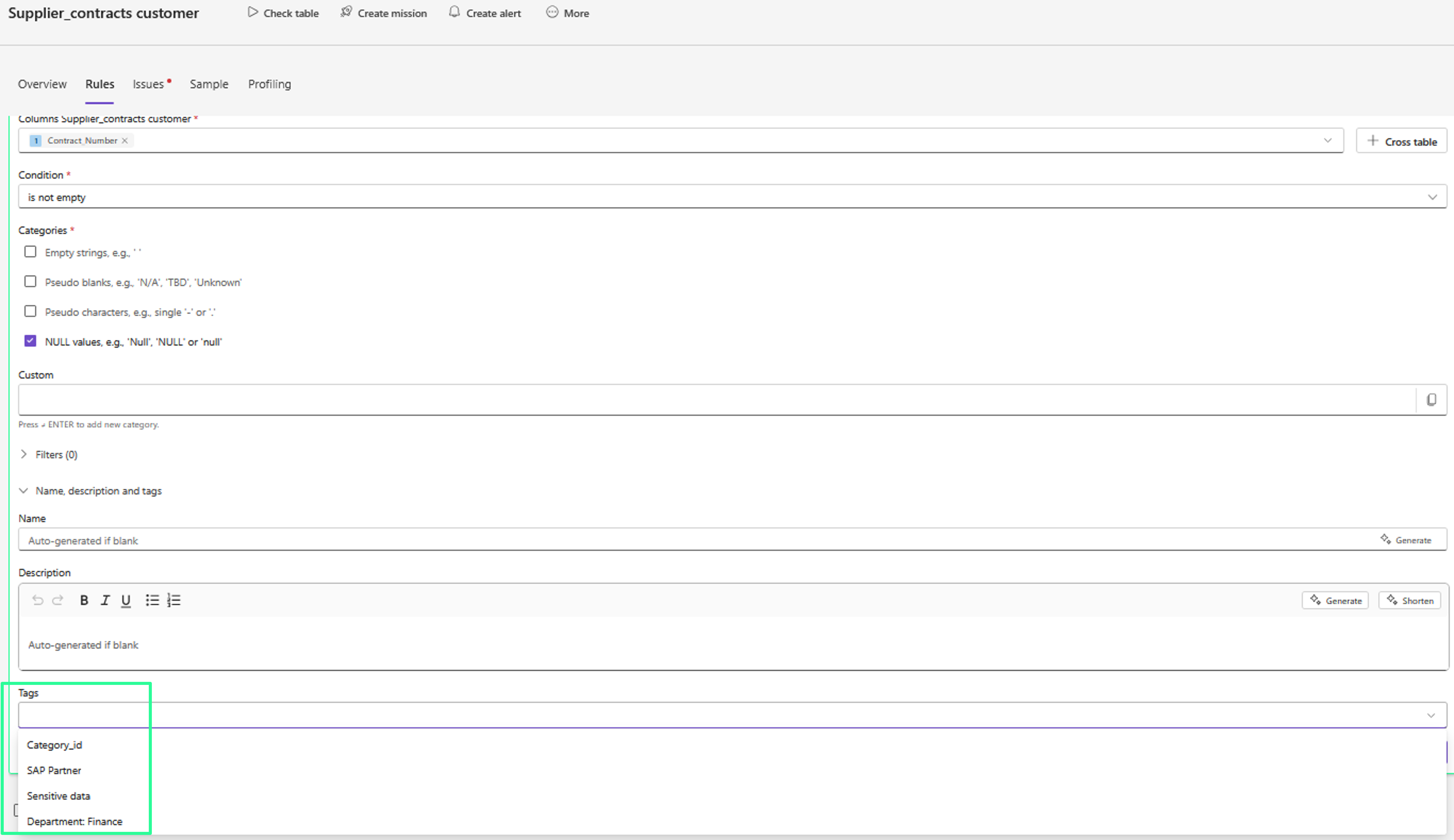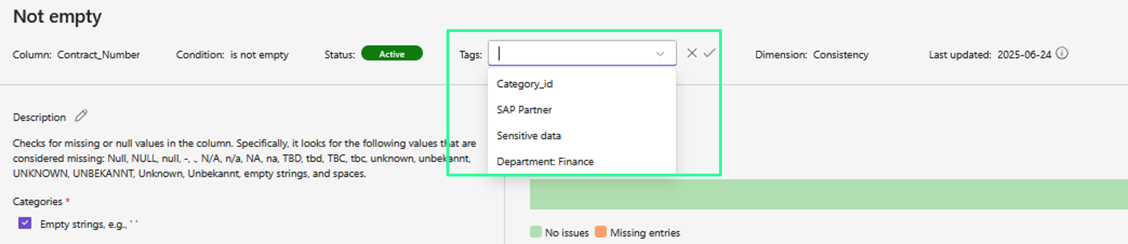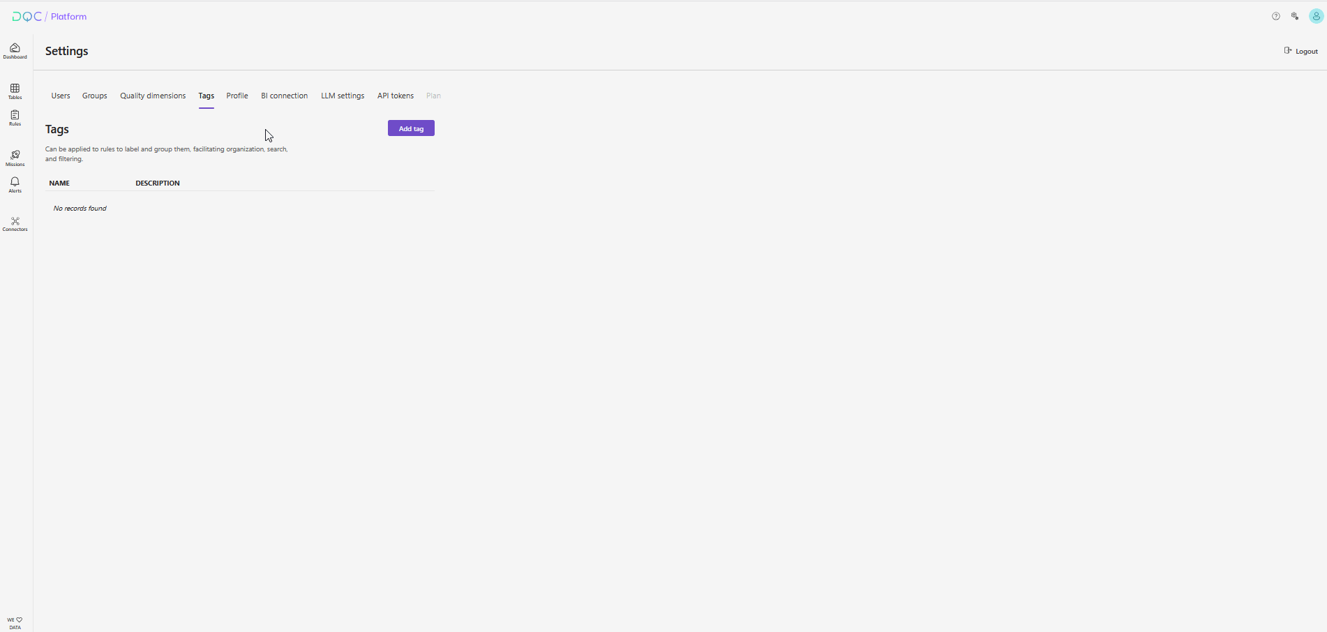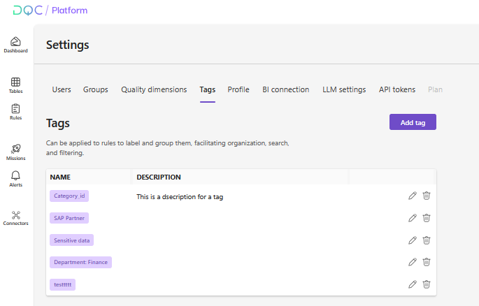 Tags help you organize and manage your data quality rules in a more structured way. By assigning tags, you can group, filter, and search rules efficiently — making it easier to maintain oversight across large rule sets.