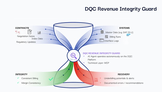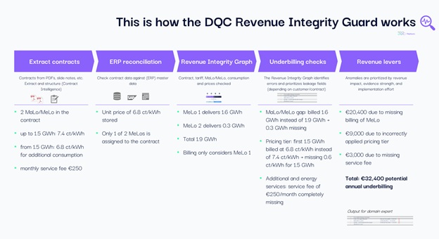 The DQC Revenue Integrity Guard on the DQC Platform systematically analyzed the complex relationships between contracts, billing, and consumption, and automatically identified revenue losses. It did so as follows: